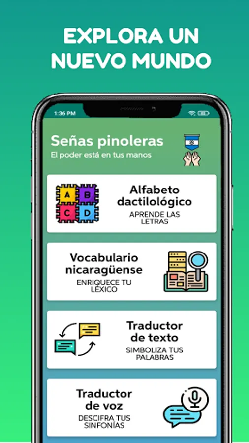 Señas pinoleras is an application capable of providing the user with the ability, both to learn and translate, oral language into Nicaraguan Sign Language (LSN) through the different tools provided by it, based on Law No. 675.