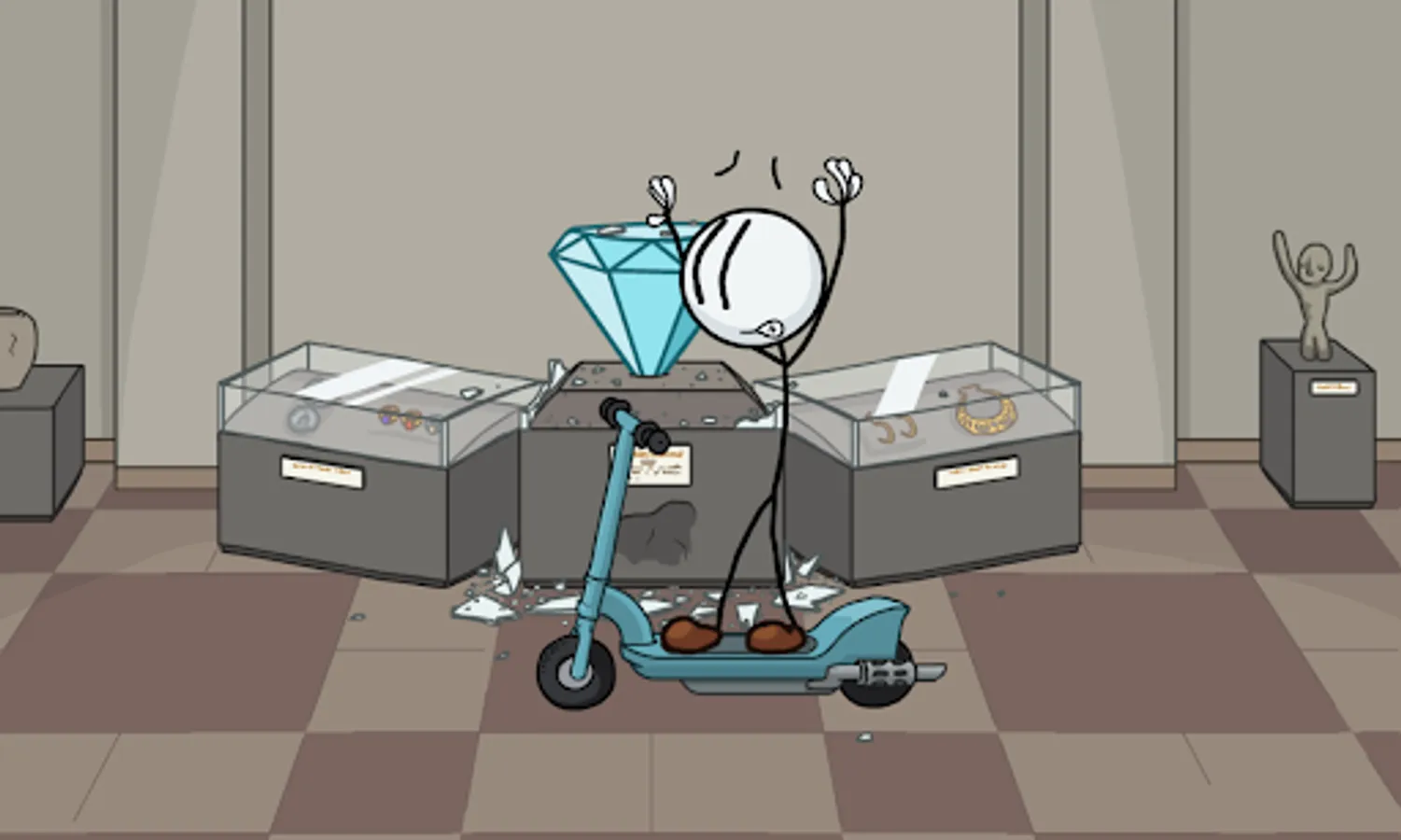 Your mission is to help stickman stealing the diamond from the exhibition. Think out of the box and make your choice. Anti-gravity, shrink ray teleporter etc are all available. Maybe you can shrink the diamond and nobody will notice? Enjoy your adventure.