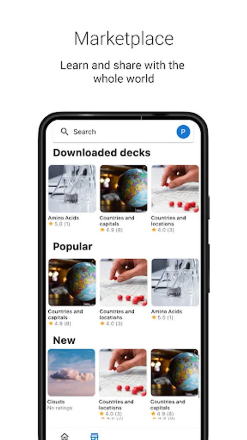 2. 🏬 Marketplace: Share your flashcards for free and learn ready-made flashcards from others.