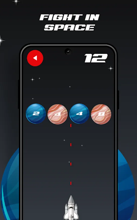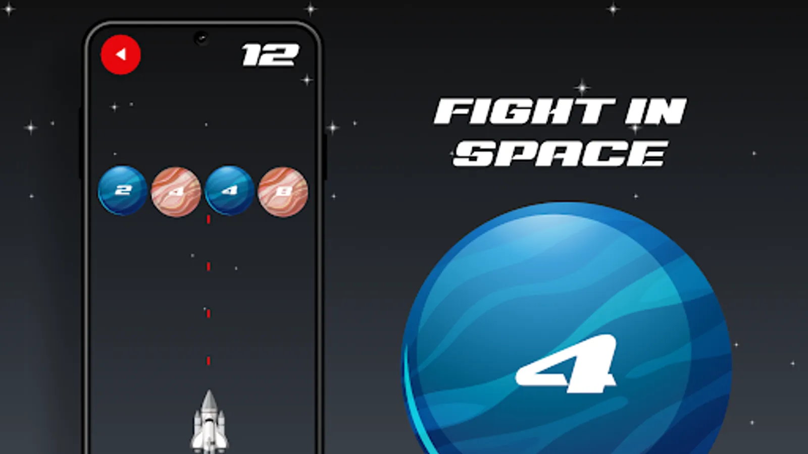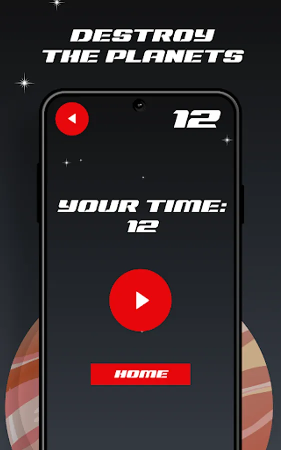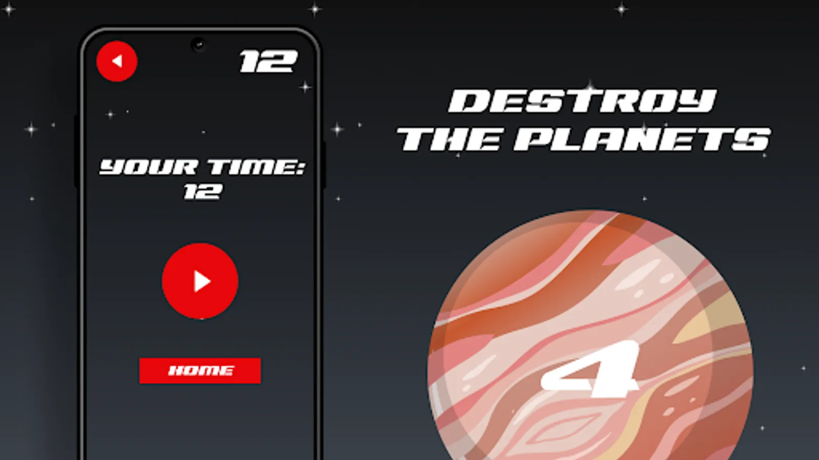 In this game you have to destroy the planets in the longest time. The planets move downwards. Each planet has a counter (the number of shots on the planet to be destroyed). The ship shoots automatically, the ship is controlled by the player moving it left or right. If the ship collides with a planet, the game is lost.