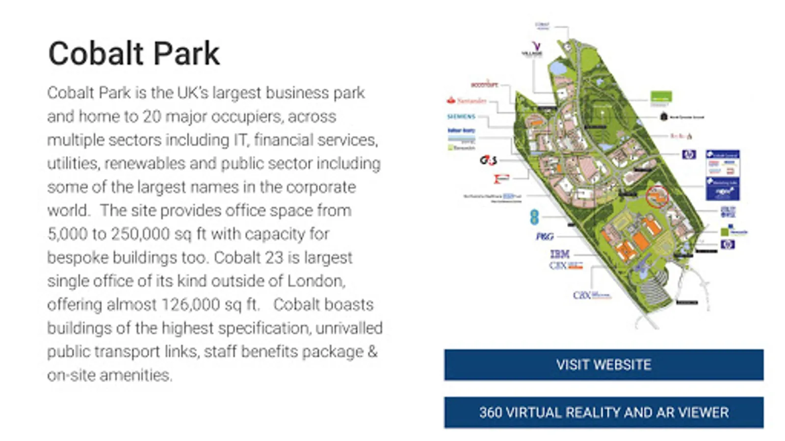Cobalt Business Park is located in Newcastle upon Tyne, United Kingdom. A world-class location housing world-class businesses, Cobalt has everything a modern business needs to thrive. From 5,000 to 250,000 sq ft space available with capacity for bespoke buildings. Experience a thrilling drive around the business park in 360 Virtual Reality!