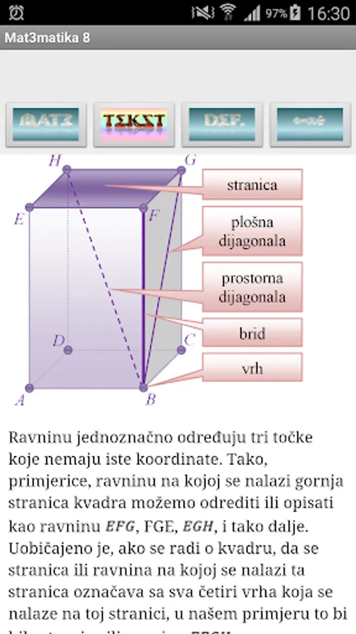 Points, lines and planes in space, the cuboid and the cube, the relative positions of two lines, the relative positions of the two planes, the relative positions of lines and planes, orthogonal projection of points on the plane, the distance from point to plane