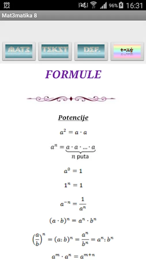 Squaring, square of the sum and difference, a difference of squares, powers, scientific notation number in the calculation, with powers, the square root calculation, the roots, the rationalization of the denominator, enter the root, partly root, the quadratic equation