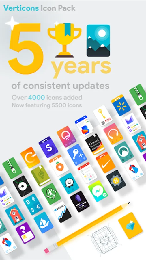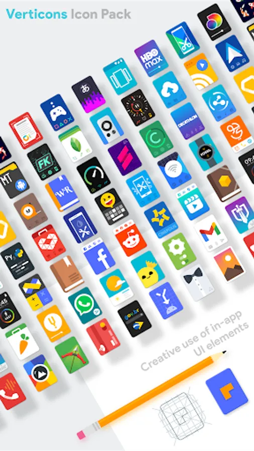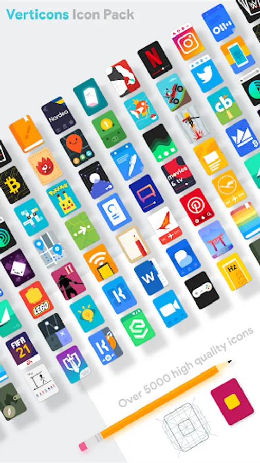 Verticons is a rectangular card material icon pack that loosely sticks to material design guidelines, tweaking them for a fresh user experience. In particular this icon pack avoids use of long shadow and makes extensive use of drop shadows and vivid colors.