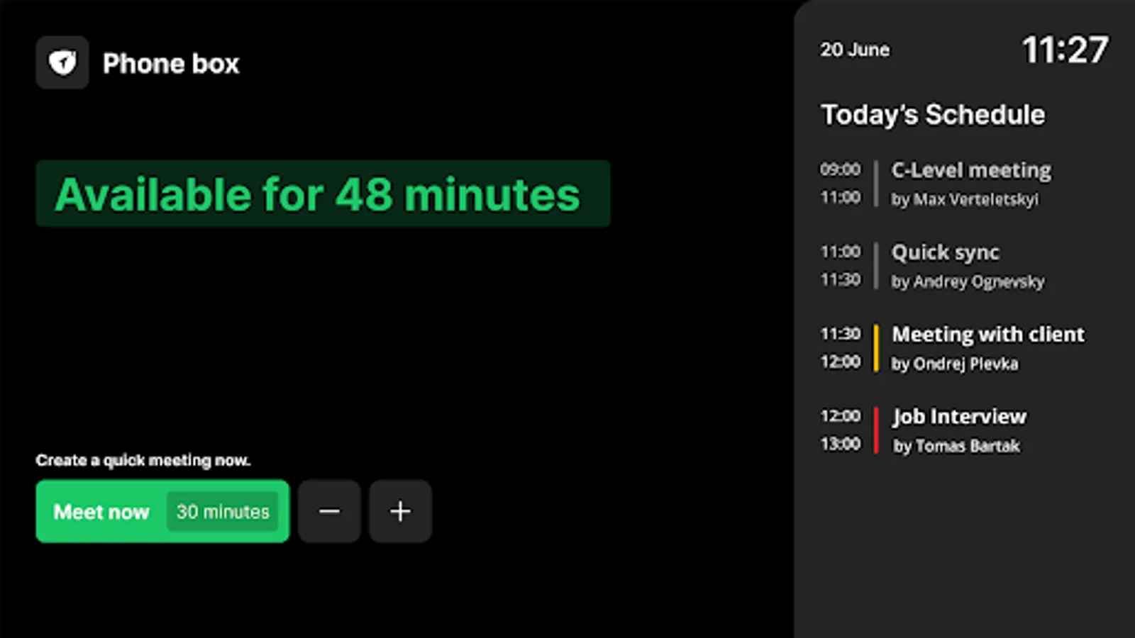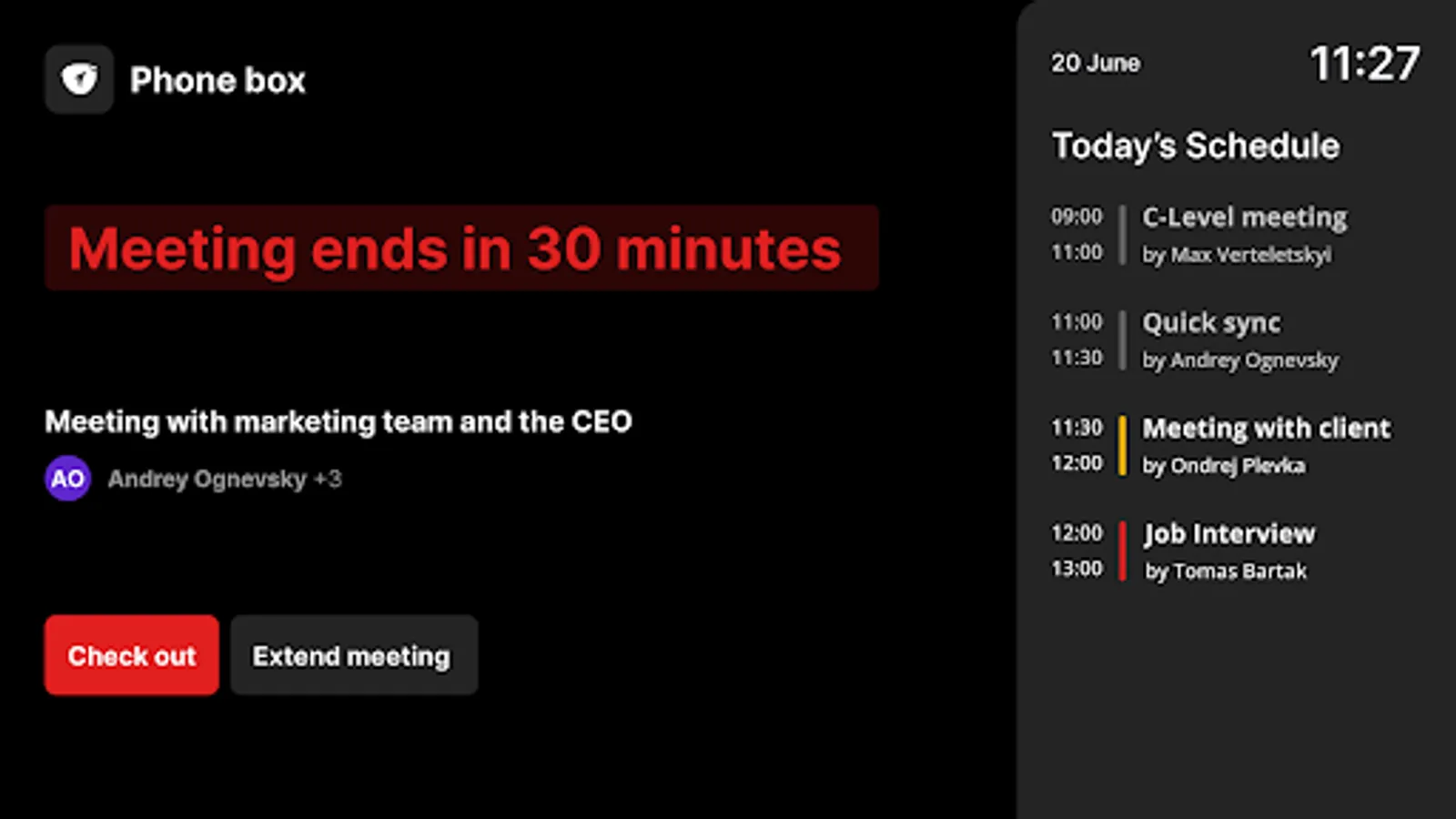 The new tablet app for meeting rooms enables You to display all the bookings of the specific meeting room, create bookings, and check in right on the spot without using a mobile application.