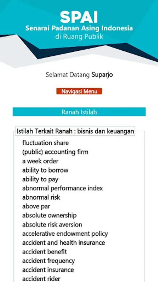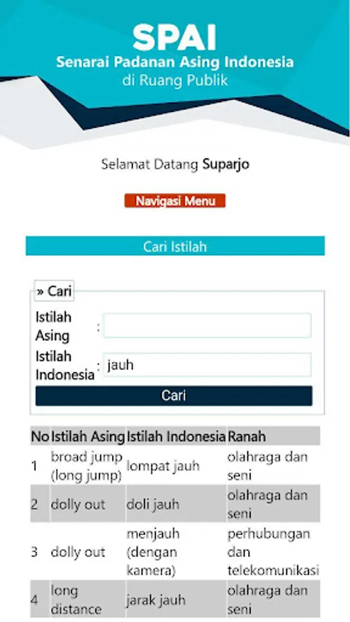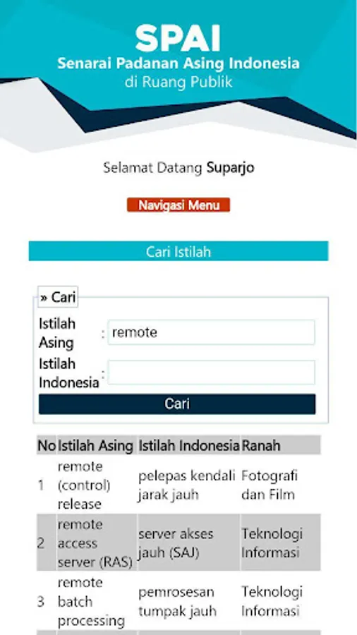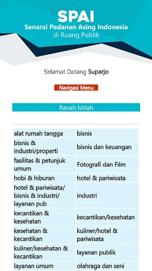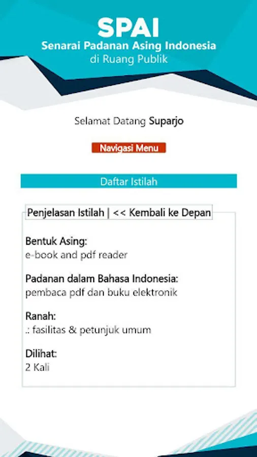 The SPAI (Indonesian Foreign Match List) application in public space is an application that is managed and developed by the Language Development and Development Agency, Ministry of Education and Culture, to provide information to the public about the equivalent of foreign terms in Indonesian. The public can use this application by downloading the Playstore for the Android version, and opening an online version with the address spai.kemdikbud.go.id