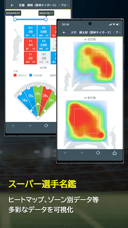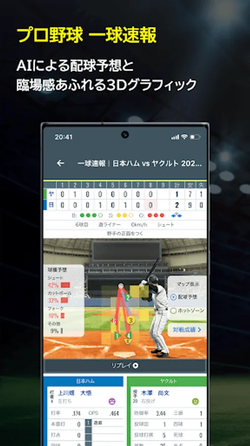 In addition to predicting the type and distribution of pitches and the direction of hitting by artificial intelligence, the "trajectory of pitching" thrown by the pitcher and the "trajectory of hitting ball" hit by the batter are delivered in real time with realistic 3D graphics!