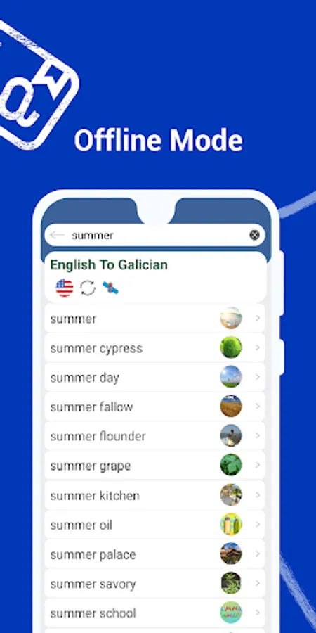 • Both offline and online translation – You can use English to Galician Dictionary app even when you are not connected to the internet.