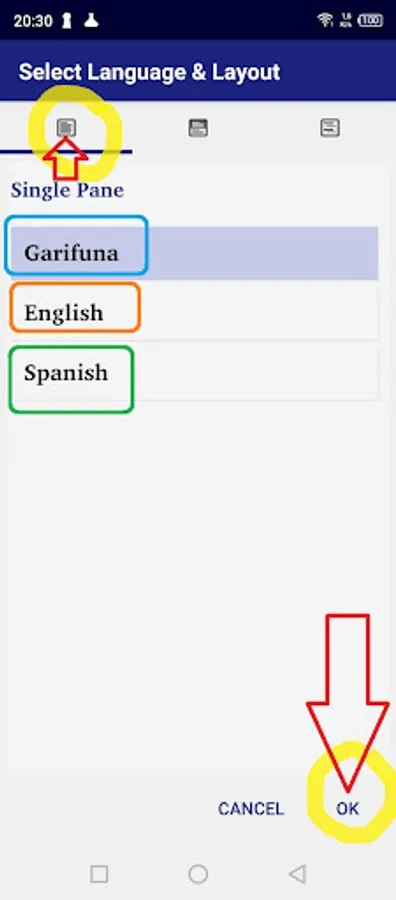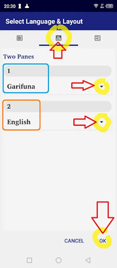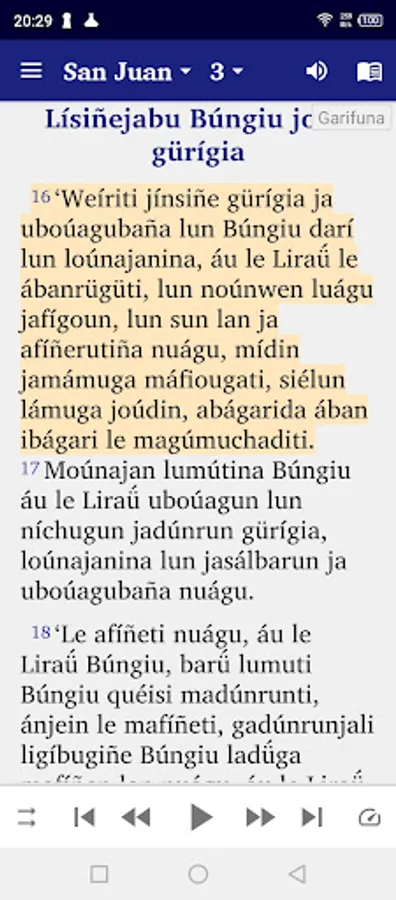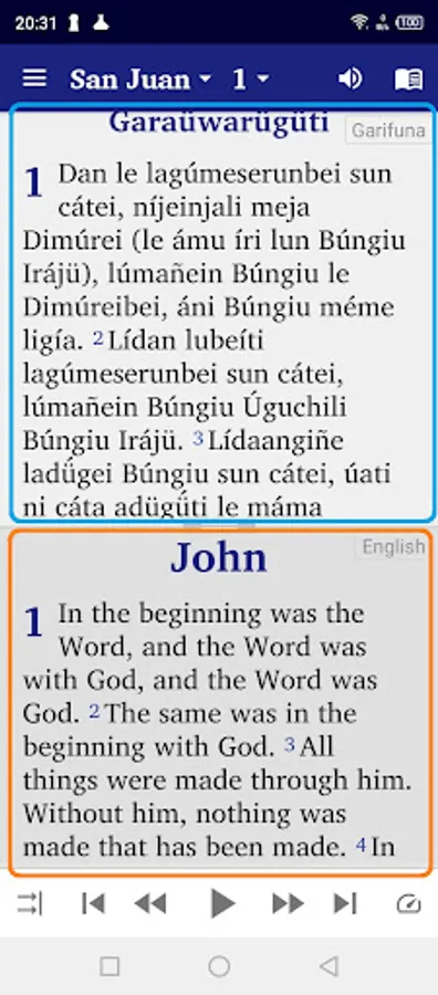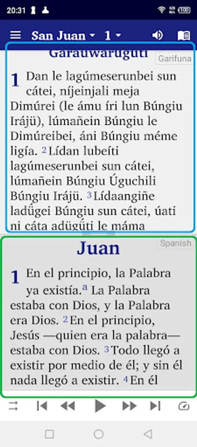 - "two panes" to display the the language of your choice at the top and an other version 1) Garifuna New Testament; 2) English Bible, 3) Spanish Bible at the bottom