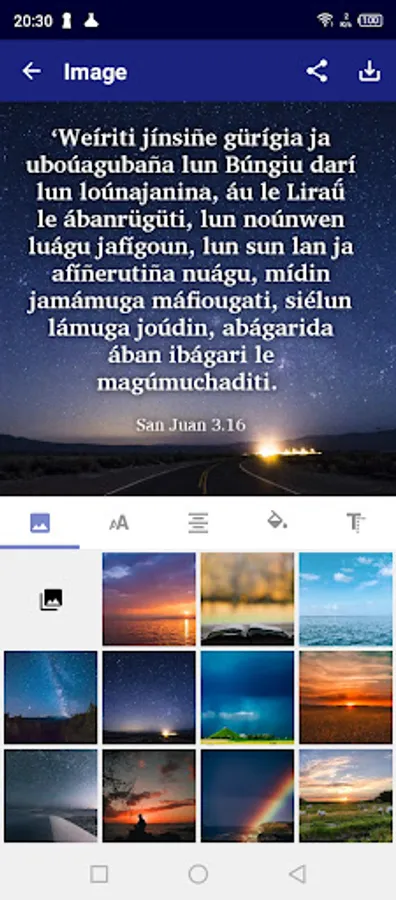 • When you tap on a verse, an image button is shown on the bottom toolbar. When this button is pressed, the ’Edit image’ screen appears. You can choose the background image, move the text around the image, change the font, text size, alignment, format and colour. The finished image can be saved to the device and shared with others.