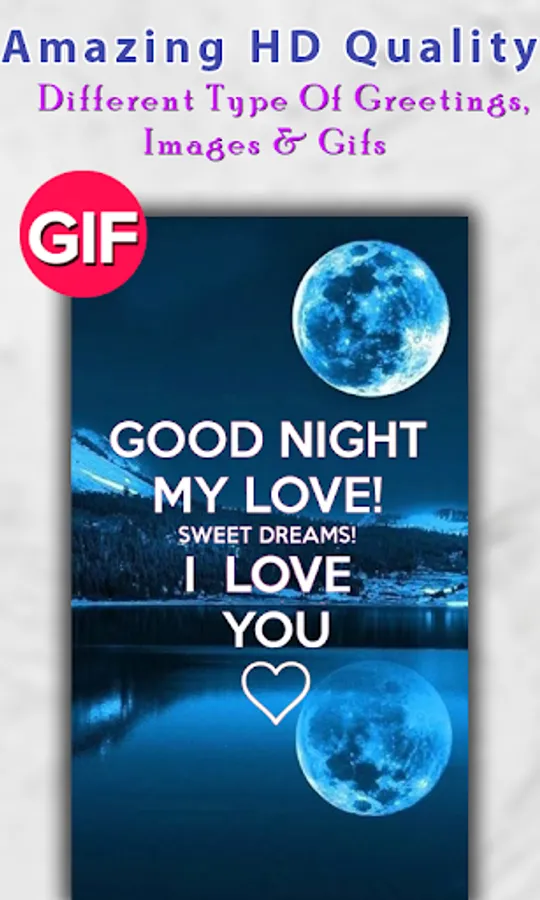This Application consider Good Night GIF Based on Day, Love, Sun, Have a nice Day, Tea, Birds, Water, Star, Heart, Coffee, etc.