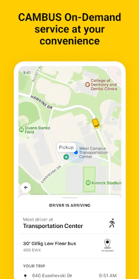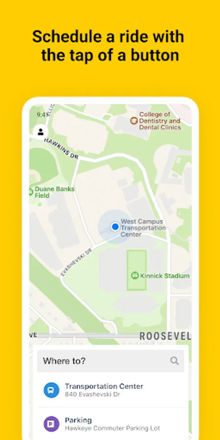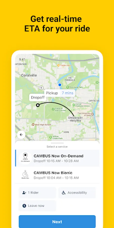 The CAMBUS Now app allows riders to schedule on-demand rides on the University of Iowa campus. The app features ride scheduling, live ETA’s, and notifications about your trip.