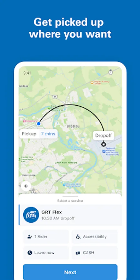 GRT Flex is a public transit option in the Region of Waterloo. It provides on-demand transit, has no fixed route, uses smaller vehicles and customers book their ride in advance.