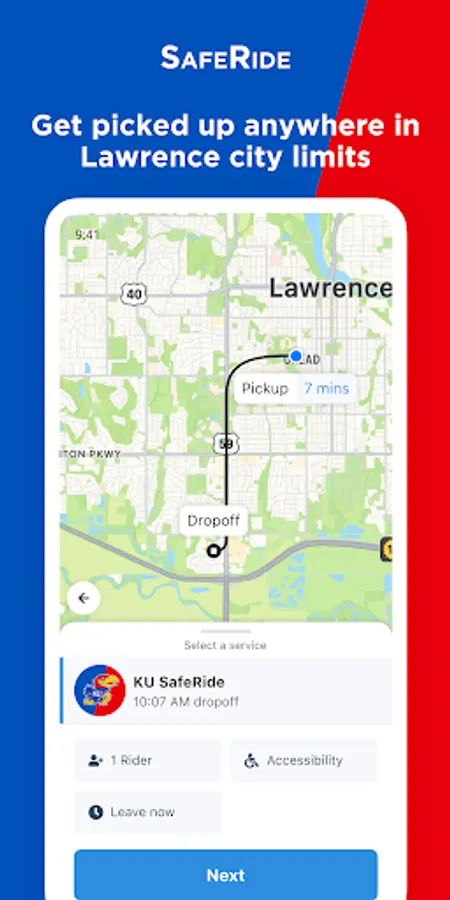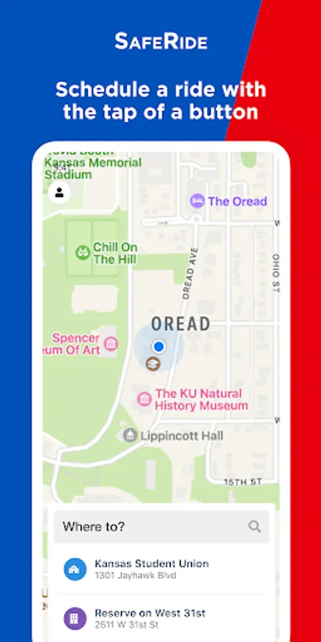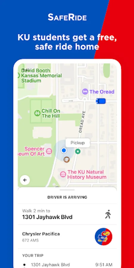 The KU SafeRide app allows students to request a trip home from anywhere inside the Lawrence city limits. Instantly notify drivers of your request, see where they are in real time, and receive a push notification when they arrive.