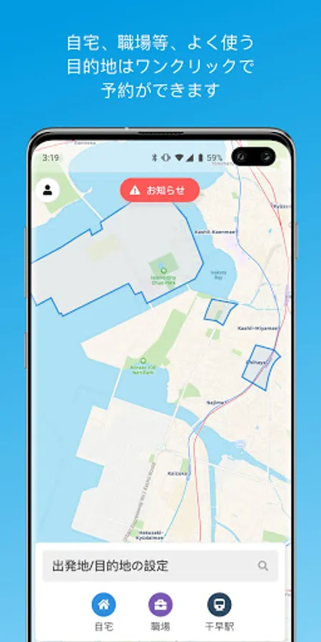 KnowRoute is a new type of public transportation utilizing AI and making efficient route matching with passenger demand. You can book KnowRoute by just setting your origin and destination when you are in KnowRoute service area. In response to the booking request, KnowRoute comes to pick you up at a nearby bus stop, and take you to a bus stop close to your destination. Please feel free to use this new type of public transportation and make your daily life better!