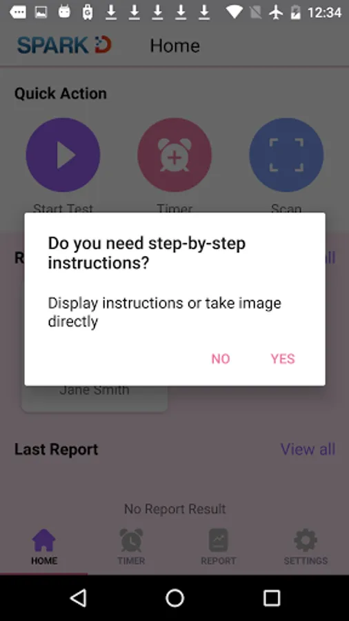 Tutorial – Step-by-step instructions through the entire testing process to measure Vitamin D. The test is performed by collecting a blood sample from the fingertip and using the Spark-D test device (sold separately). The app is used to scan the test device by using a smartphone camera that enables quantitative reading. The SPARK-D app measures vitamin D and shows the results on the smartphone.