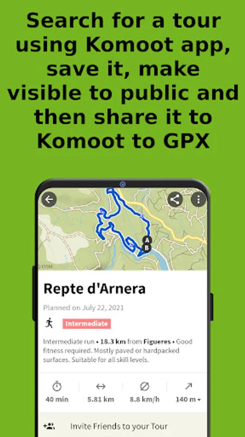- Download a GPX file from Komoot saved tour, sharing it from Komoot or type its link (https://www.komoot.com/tour/...).