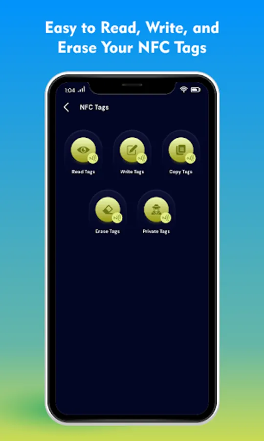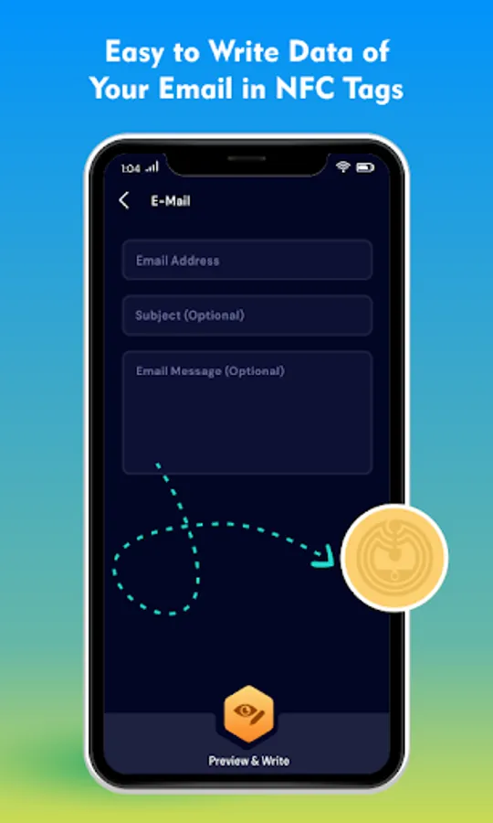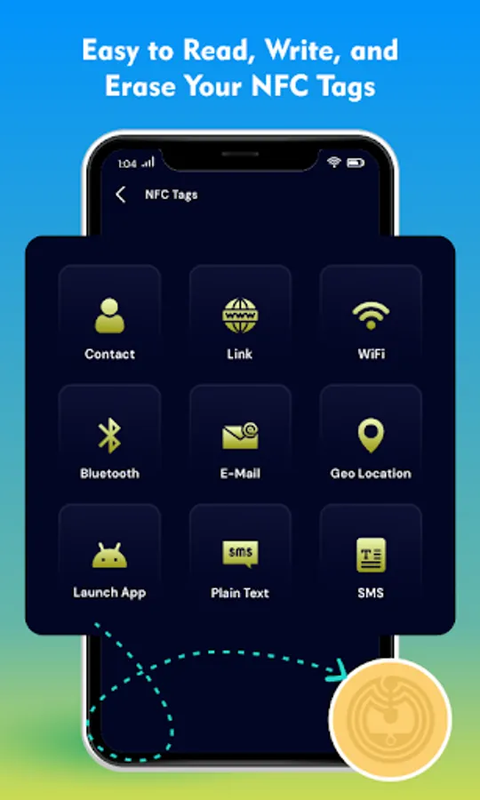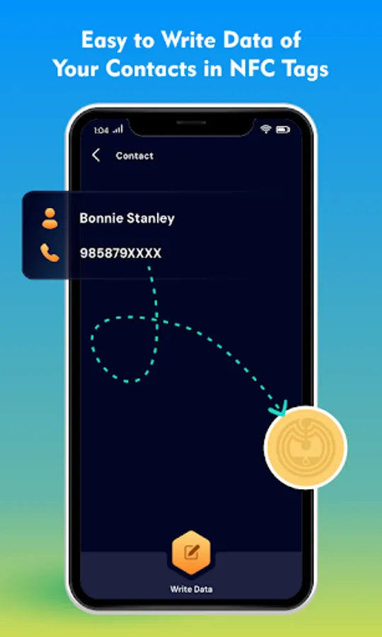 Many kind of data write in NFC like contact, link, WiFi, Bluetooth, E-Mail, Geo-Location, Launch App, Plain Text, SMS.