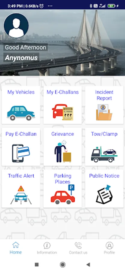 App facilitates viewing traffic education material and payment of traffic challans. While installing the app, a user must register himself/ herself using his/her mobile number.