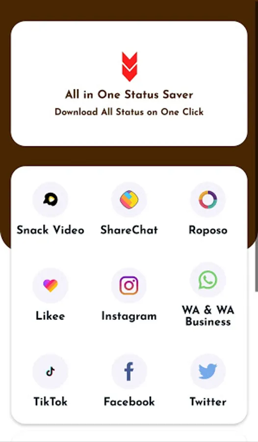 All in One Status Saver for almost all social media platforms is a free Android App to download All Social Media Videos and Images, story saver. It gives feature to Save WhatsApp, Likee, Facebook, TikTok , Instagram, Snack Video, ShareChat, Roposo and Twitter - Status, Videos, Images and story saver will All in One Status Saver. It also provide feature to easily share them from the App. Download the app and get all the features in just one application. It is application of small size with multi-feature, and thus it called it as All in One Status Saver or Video-Status downloader. Application also have the Gallery for all Saved Status, Videos and Images.