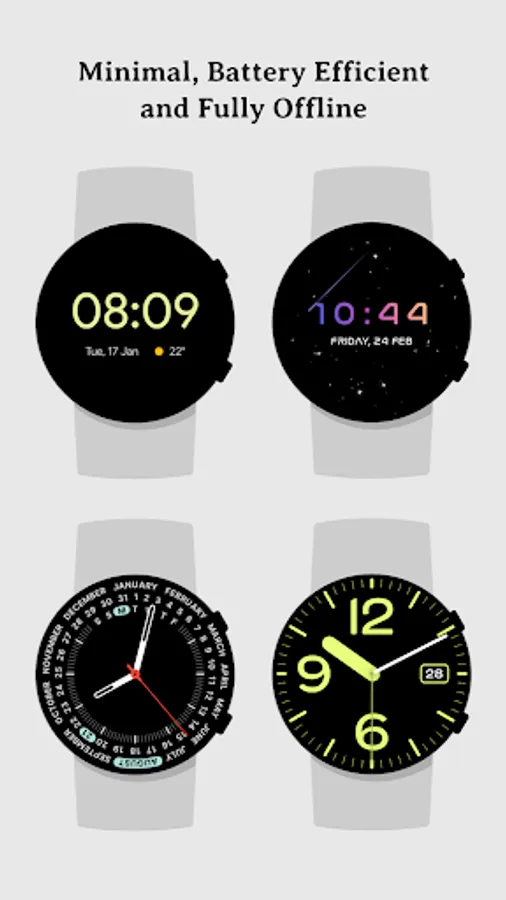 Every watch face is tuned to consume less power as much as possible without any background process. Our faces are fully offline and doesn't use any network data to show watch faces. Some of the Watch Faces available are,