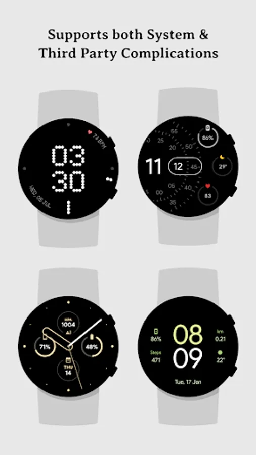 We have our own highly customizable complications which can be used on our watch faces or on any other third-party watch faces. Currently available complications are,