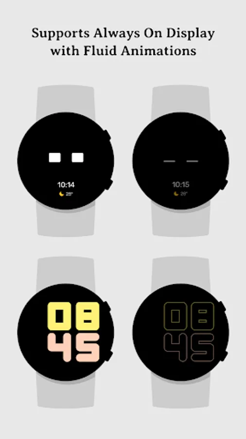 Our Watch Faces supports the display switching between ambient mode and active mode with smooth and fluid animations. Burn-in protection is already built into our faces.
