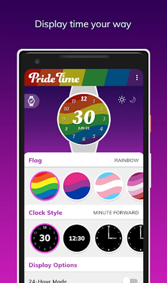 The Pride Time™ watch face is compatible with most modern Wear OS watches. The optional Pride Time™ mobile companion app requires an Android mobile phone running Android 8 or higher.
