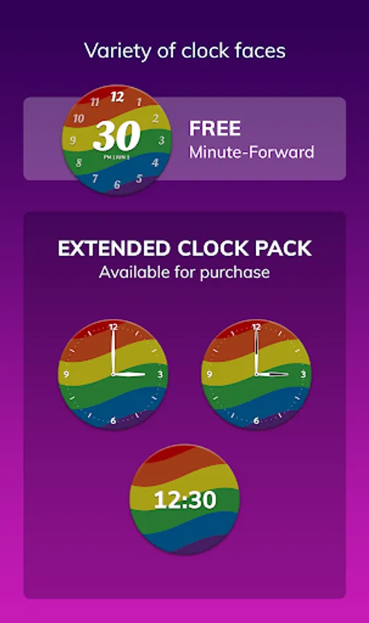 Pride Time™ is free to download and includes the standard rainbow flag 🏳️🌈, the unique minute-forward clock face style, and all of the associated options for free. You do NOT need to make any in-app purchases to successfully use Pride Time and be absolutely fabulous!