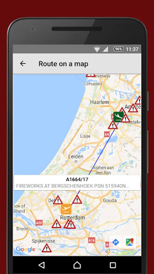 If the NOTAM text contains a coordinate, the App will place a flag on a map along with your route. This will instantly show its relevance to your plans.