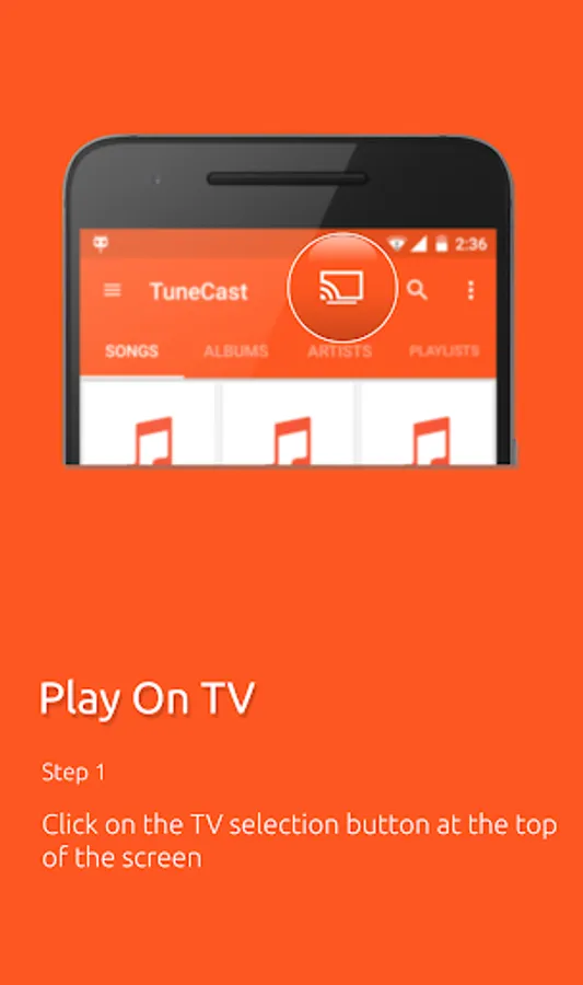 Play any music straight to your TV with TuneCast. TuneCast gives you full control over all your music files and gives you the option to stream them to any Smart TV. No need for any additional hardware, just play the songs to your tv and enjoy them on your home music system instead of your mobile speakers.