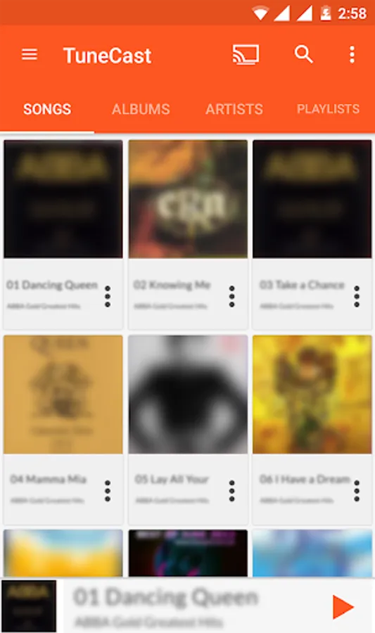 TuneCast supports just about any type of mp3, midi, wav, flac, raw, aac files and other audio formats. Easily browse songs by genre, album, artist, song name and folder and play on your phone or to your TV.