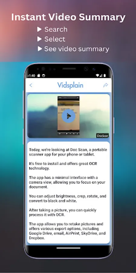 Are you tired of sifting through endless videos online, trying to find the information you need? Say hello to Vidsplain, your ultimate video summarization companion! With Vidsplain, the days of wasting hours watching lengthy videos are over. This app is your shortcut to knowledge, delivering concise and informative video summaries right at your fingertips.