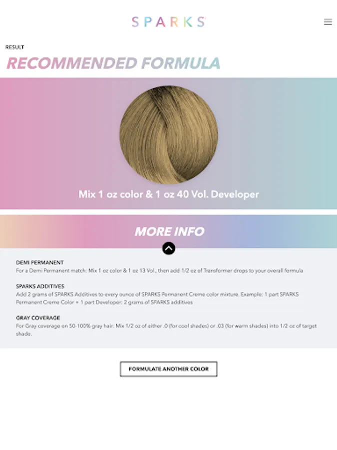 Color with confidence. SPARKS real time augmented reality "Try Me" feature elevates the client experience and upholds the power of the stylist consultation by inviting clients to visualize themselves in any SPARKS hair color shade. Industry first AR powered color formulas tailored to individual client needs are available through the SPARKS Formulator. Need hair color advice? Call the hairdressers behind SPARKS for real-time solutions to your color question! Looking for a specific shade? Scroll through the SPARKS digital swatchbook to instantly view and search all SPARKS hair colors, giving you the confidence to create any look imaginable!