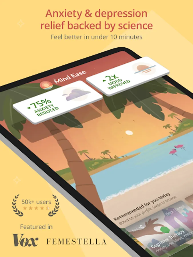 Mind Ease is an anxiety-relief app which uses best practices in clinical psychology to reduce negative feelings in each use.