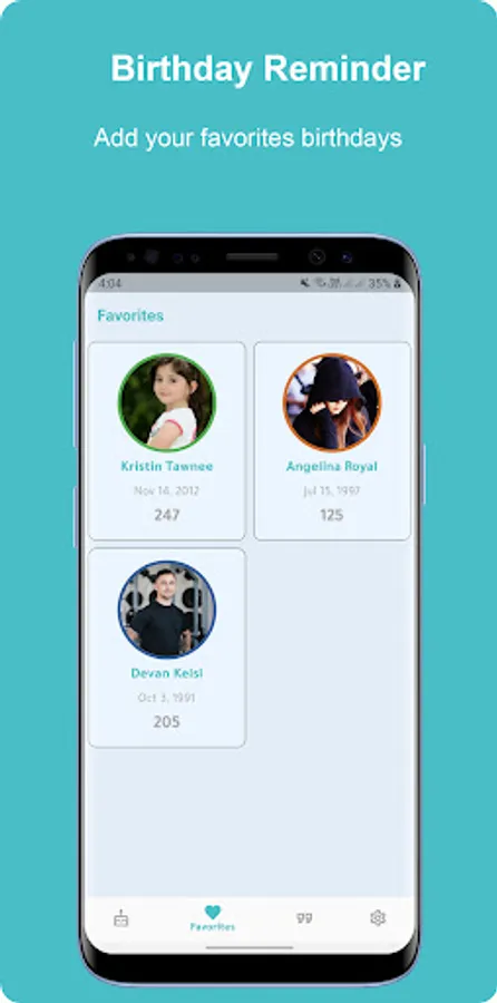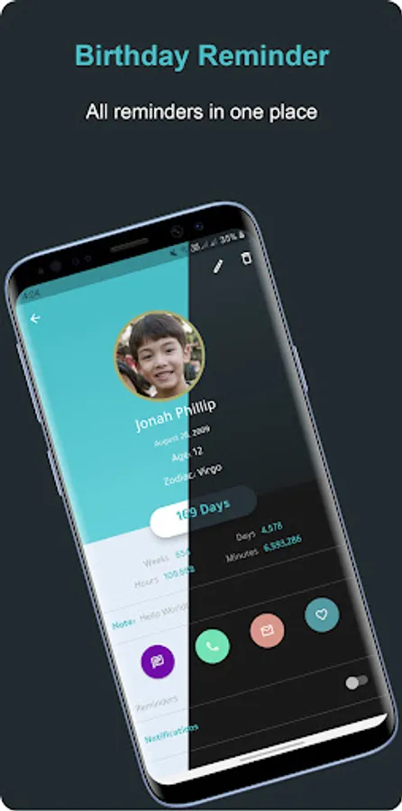 Your birthdays will never be lost. The app synchronizes all birthdays with your contacts list and offers secure backups of all dates to the external storage. They can be easily transferred to another Android device anytime. You'll l always know which day of the week your friends - and how many days are left until that date.