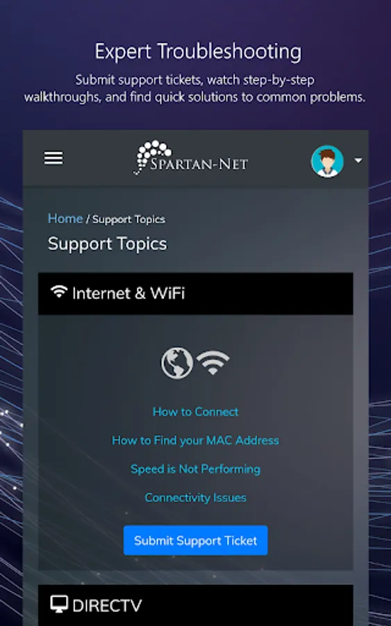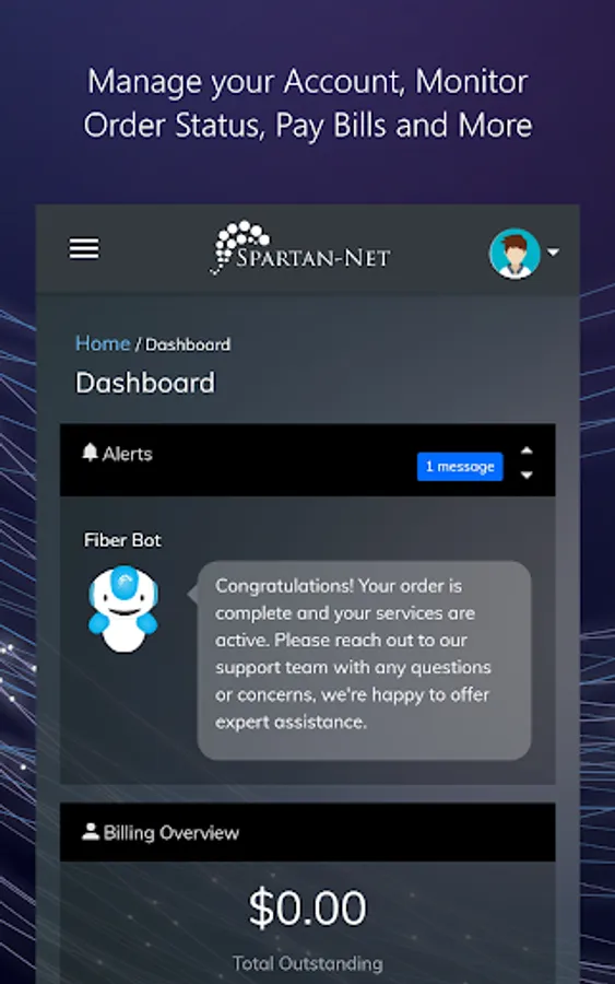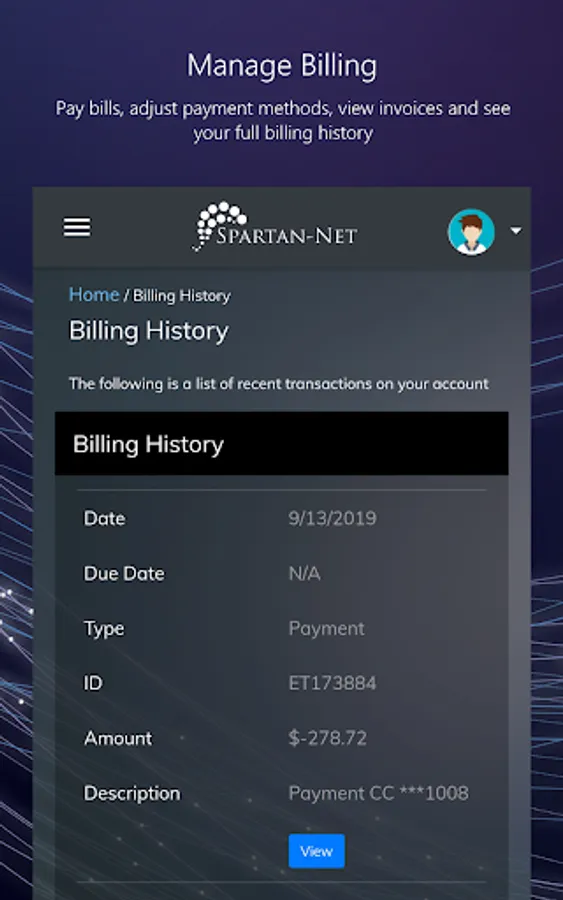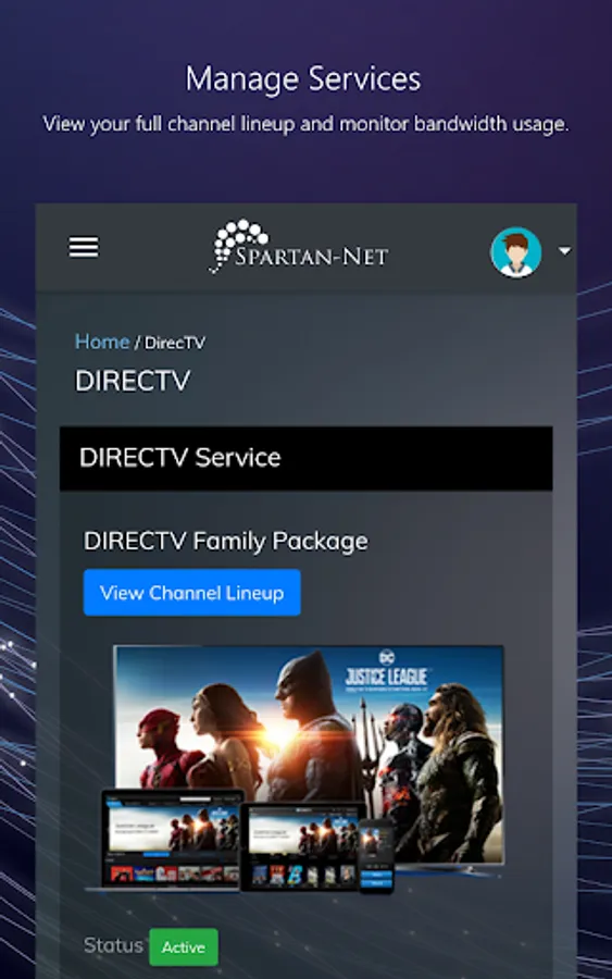 Introducing the quickest and easiest way to manage your Spartan Net account - the Spartan Net mobile app. Now you can pay bills, view payment history, check the status of orders, manage your services, view full channel lineups, submit support tickets, watch troubleshooting walkthroughs, edit your profile information and even monitor bandwidth usage. No calls, no clicks, no worries. The Spartan Net mobile app is available now, with many new features coming soon.