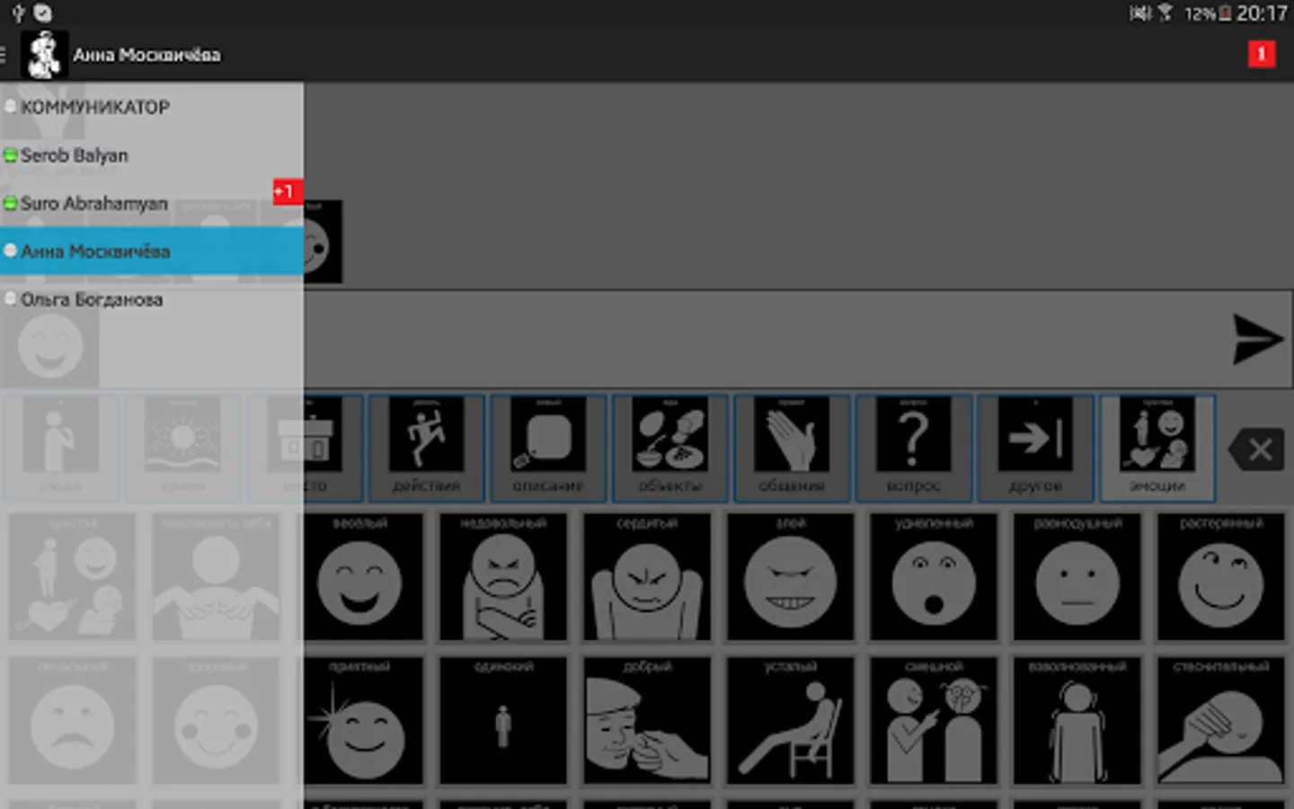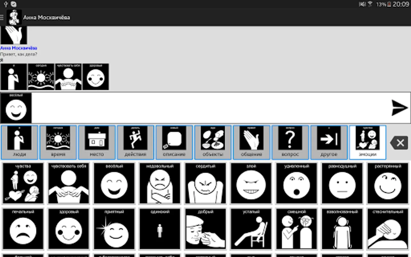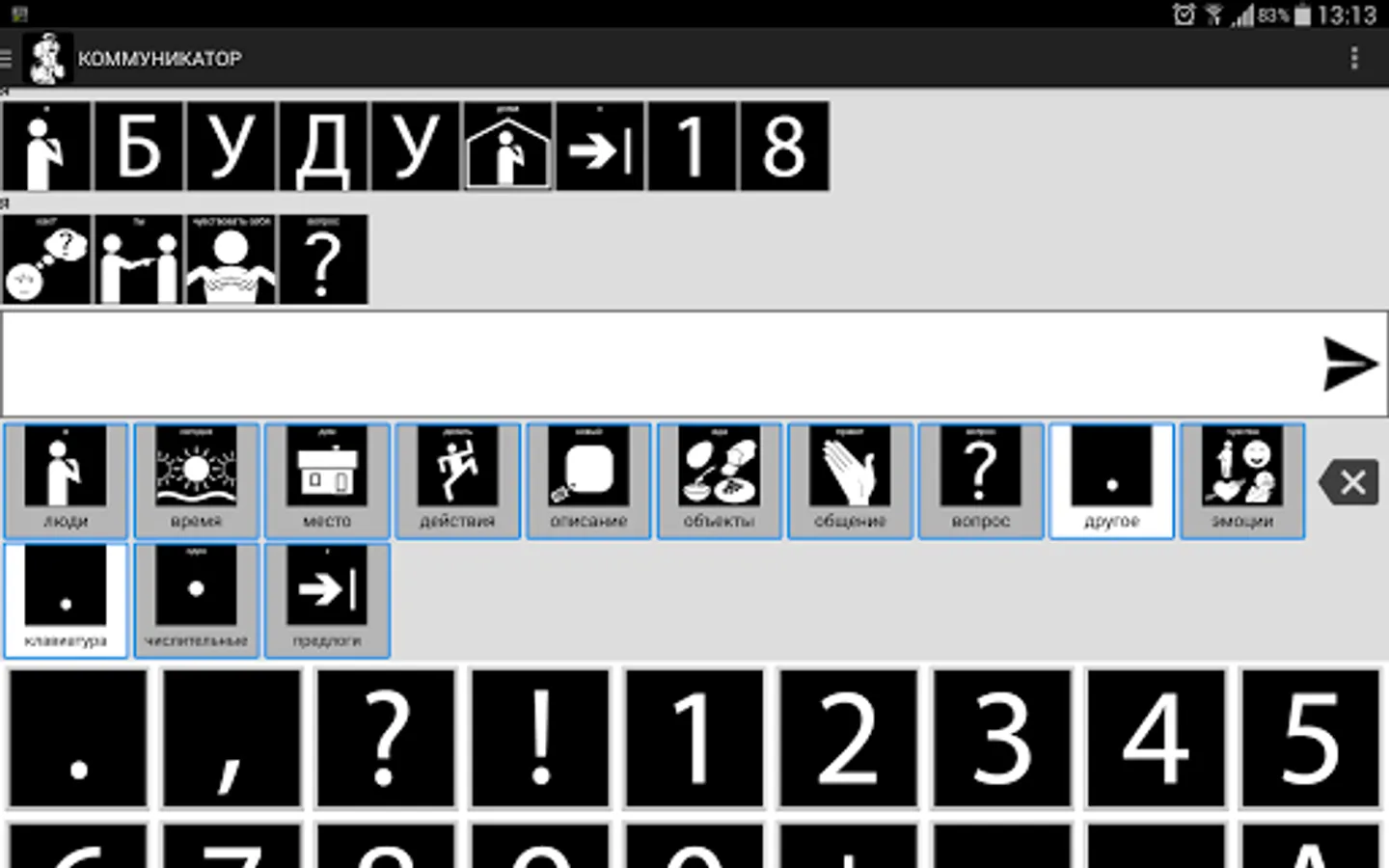 Added simplified analogue keyboard with Russian letters, numbers and the main characters that can combine messages in icons and text to create a cohesive grammatical structures.