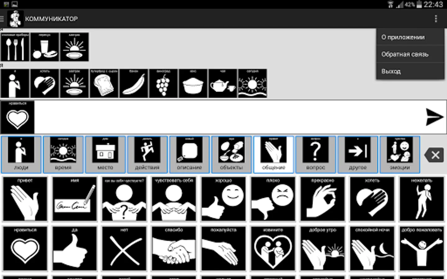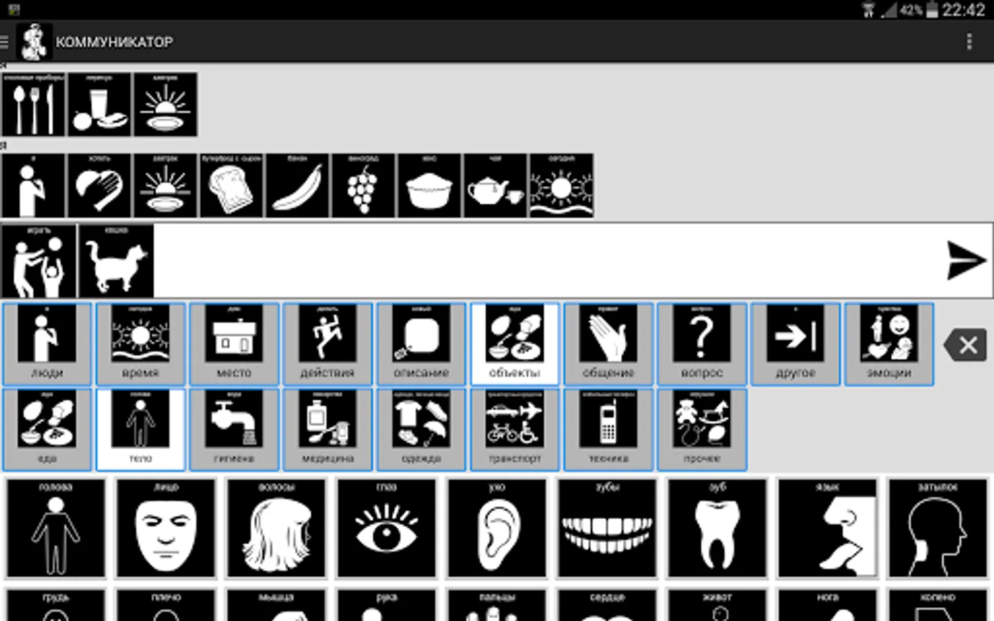 It is available about 500 black and white icons of international standard, which represent objects, actions, attributes of objects and words necessary in any conversation ( "Yes", "No", "I want", "do not want", "Thank you" "Please," and so on. n.)