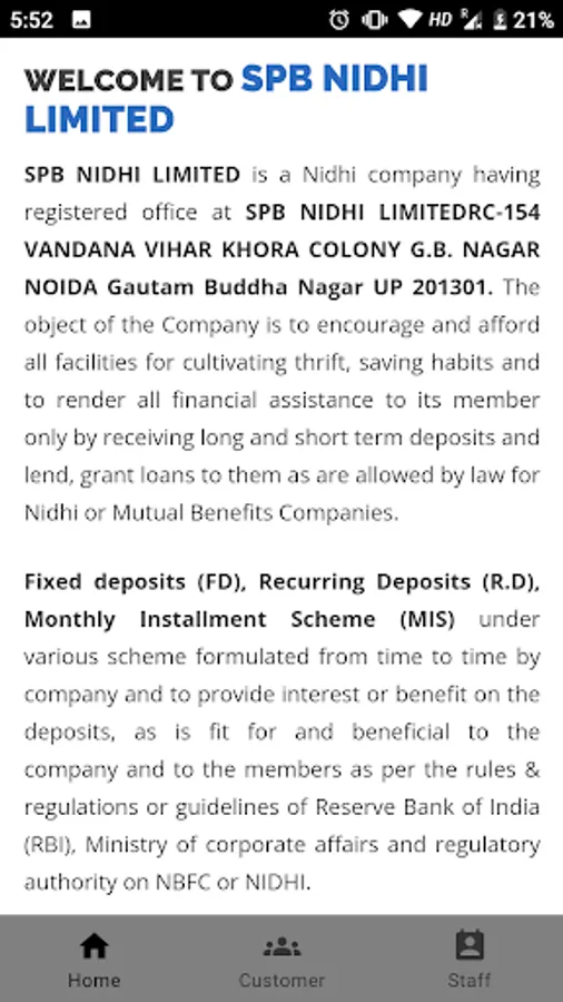 SPB NIDHI LIMITED is a Nidhi company having registered office at SPB NIDHI LIMITEDRC-154 VANDANA VIHAR KHORA COLONY G.B. NAGAR NOIDA Gautam Buddha Nagar UP 201301. The object of the Company is to encourage and afford all facilities for cultivating thrift, saving habits and to render all financial assistance to its member only by receiving long and short term deposits and lend, grant loans to them as are allowed by law for Nidhi or Mutual Benefits Companies.