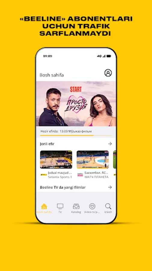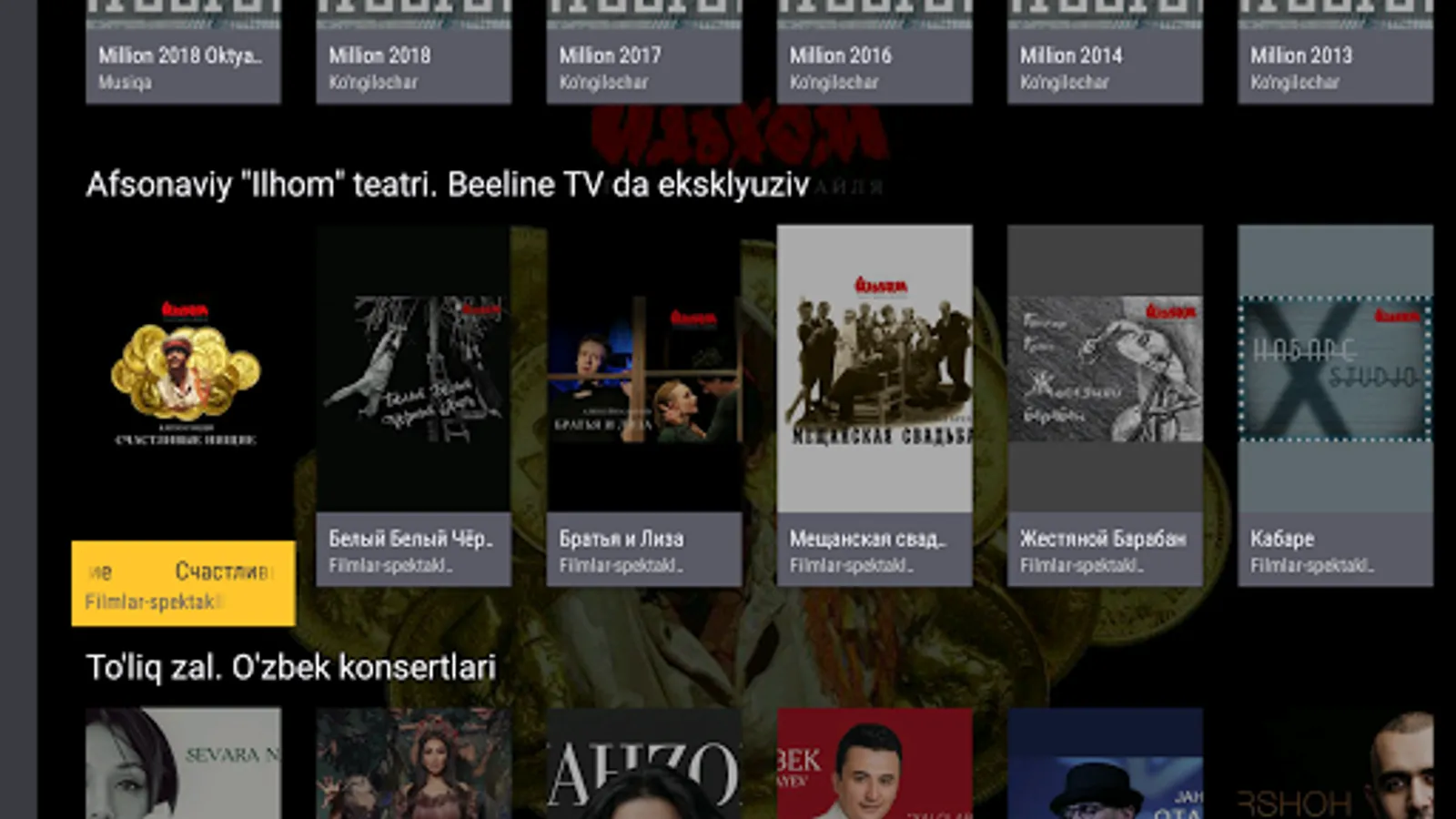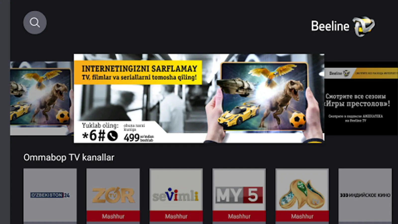 Watch Beeline TV online cinema: TV, Uzbek films and series, world-rated movie hits, cartoons, clips and concerts of your favorite artists.