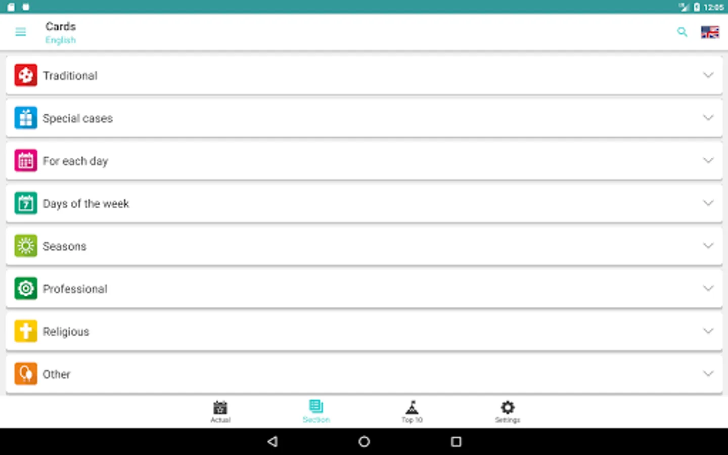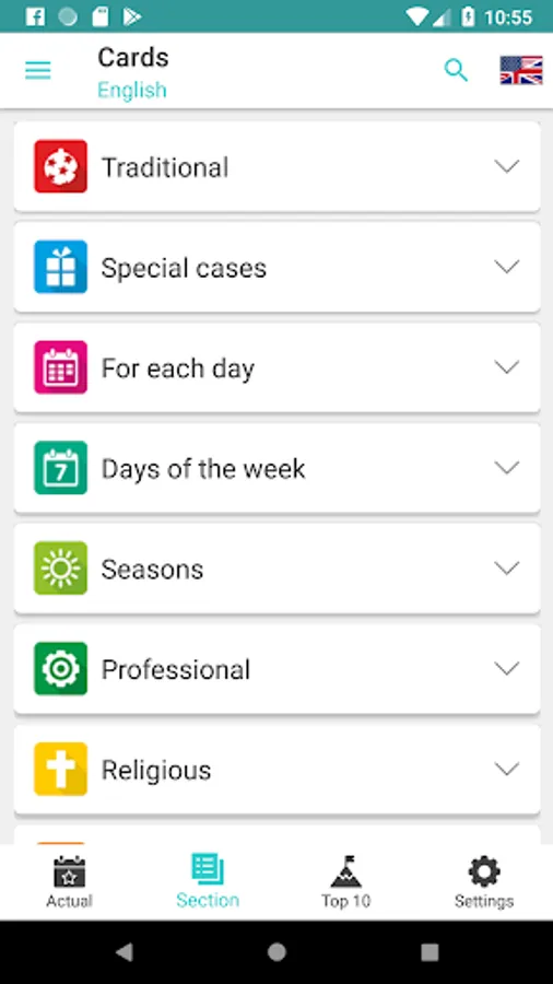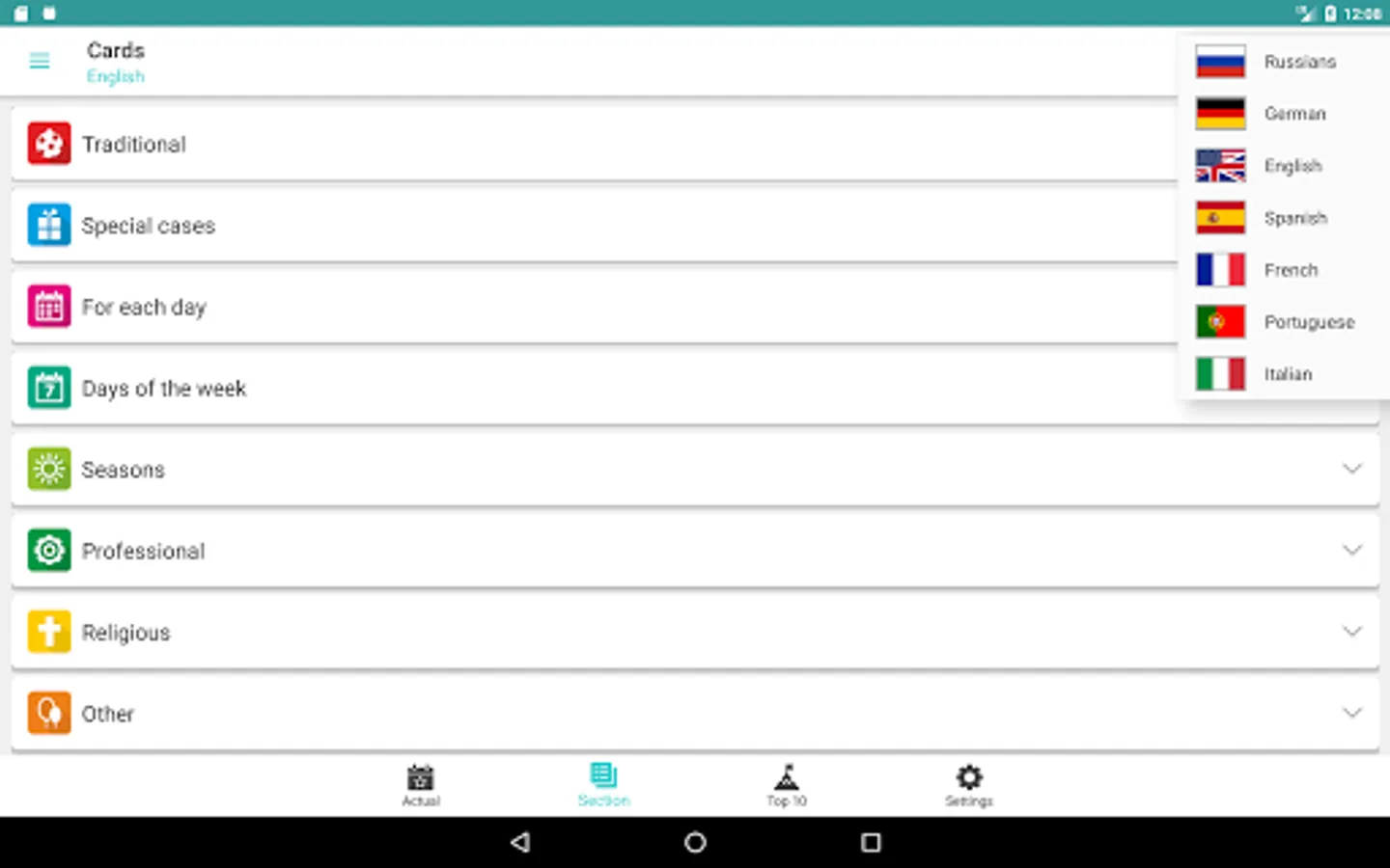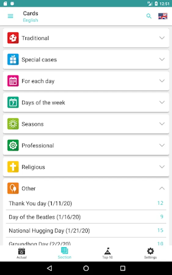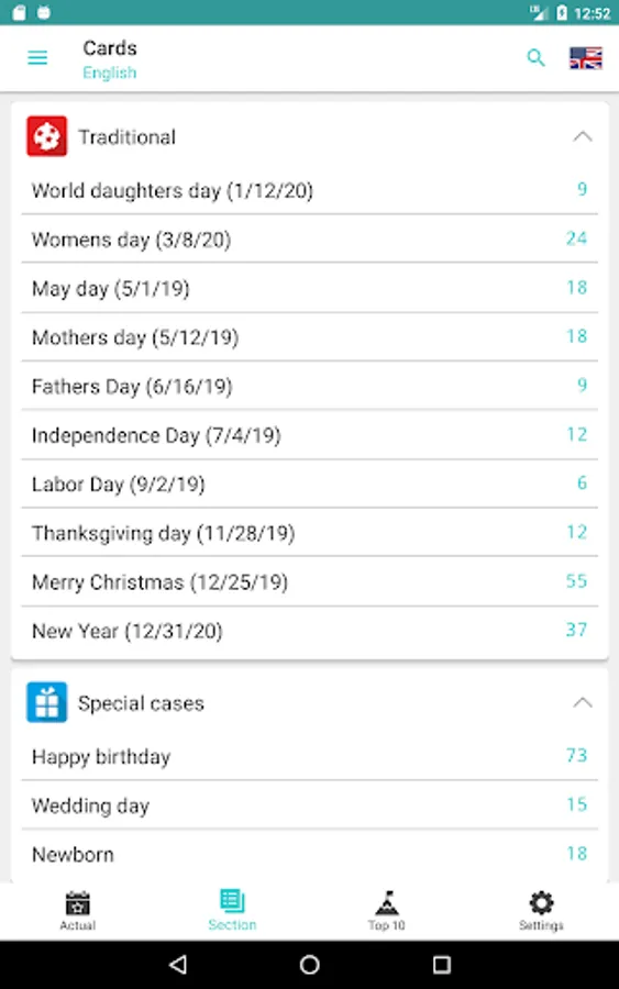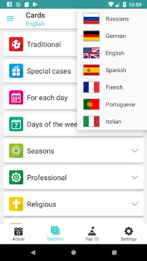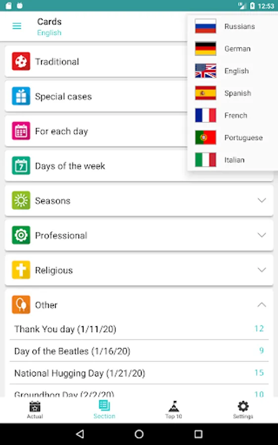 There is a separate window where you can see which holidays are relevant today. Also you can see the most popular sections and holidays (Top 10 for today).