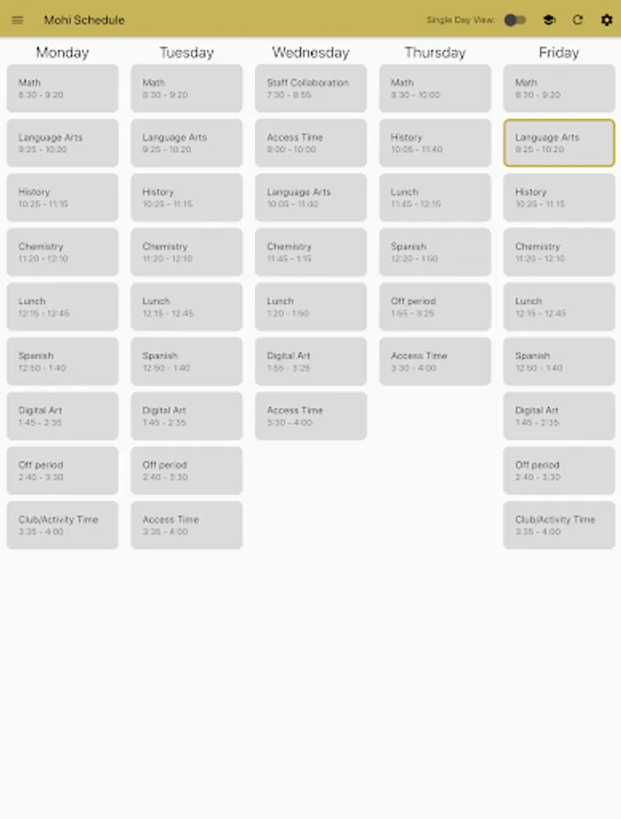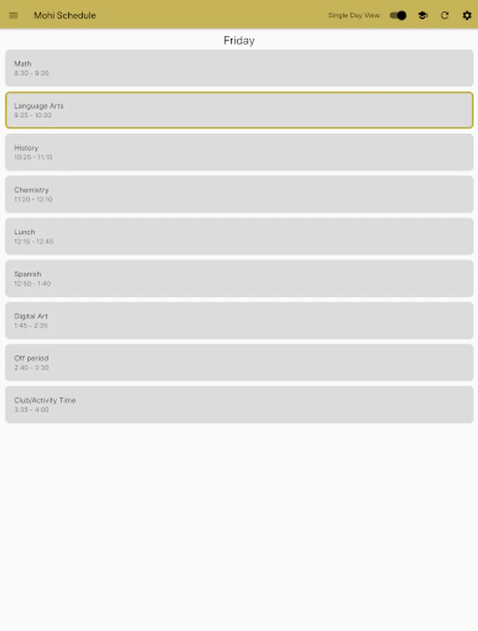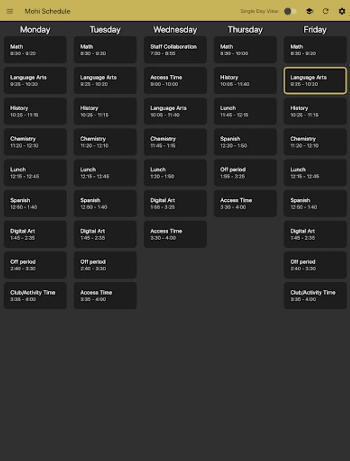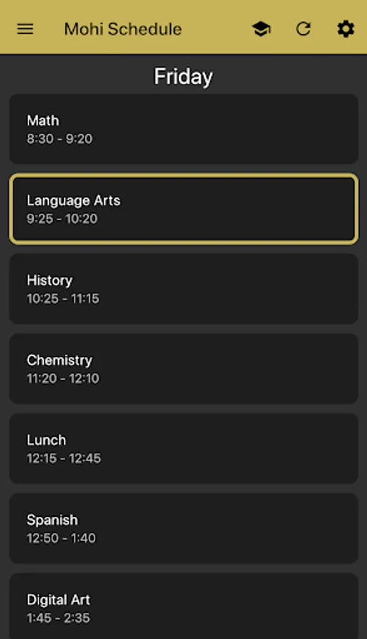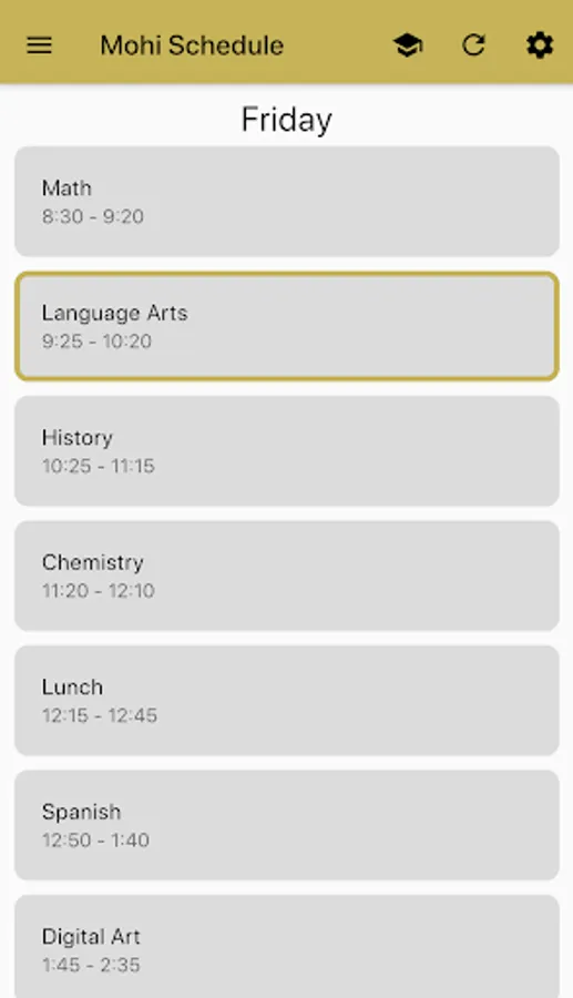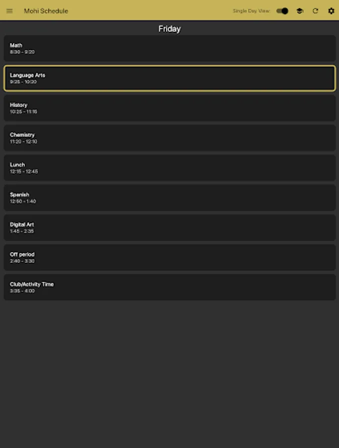 Monarch Bell Schedule is a simple app for keeping track of when your classes start and end at Monarch High School. You can customize it by naming each of your 7 periods, and changing which lunch you have. The app will highlight the current class based on your phone's clock.