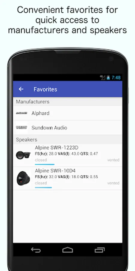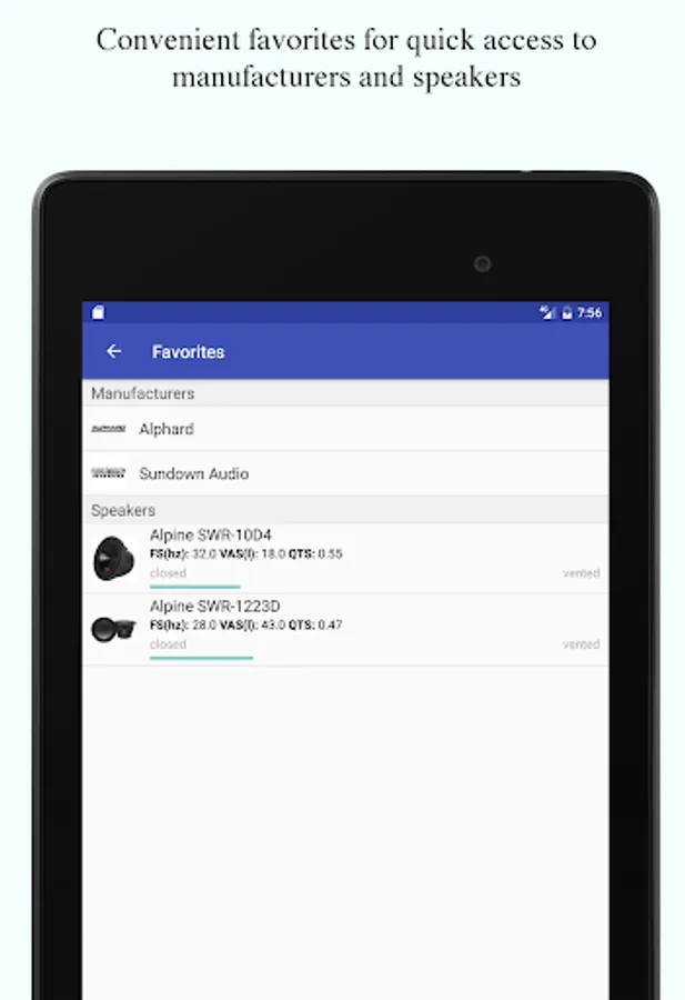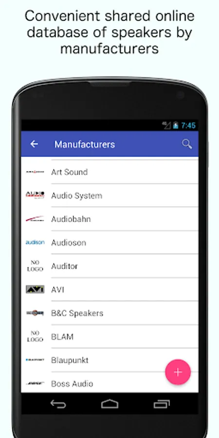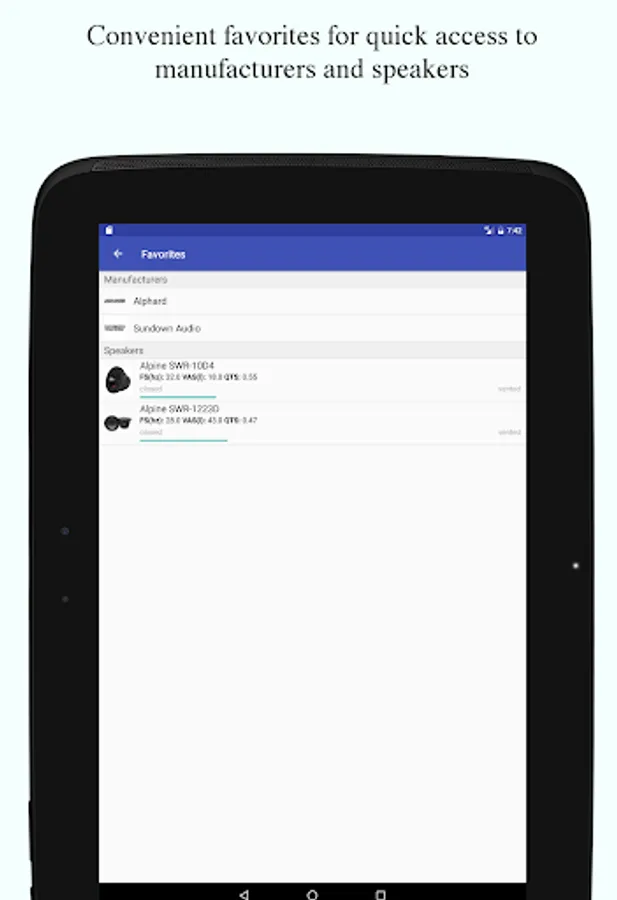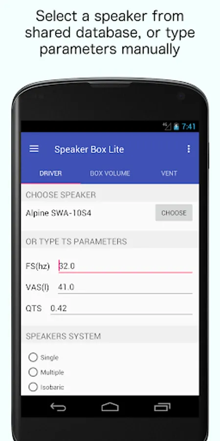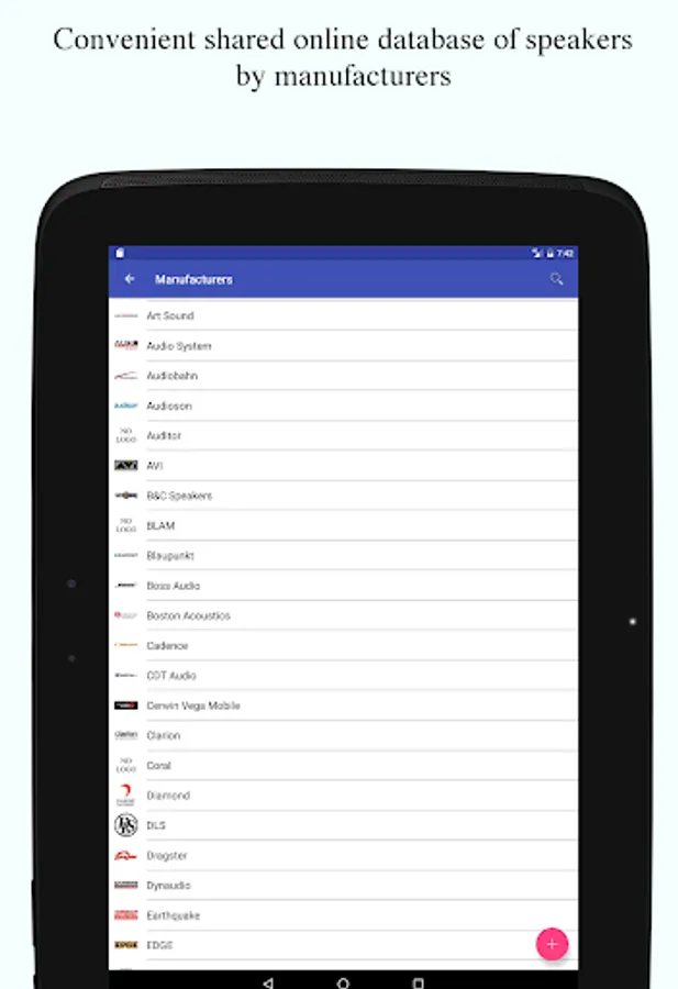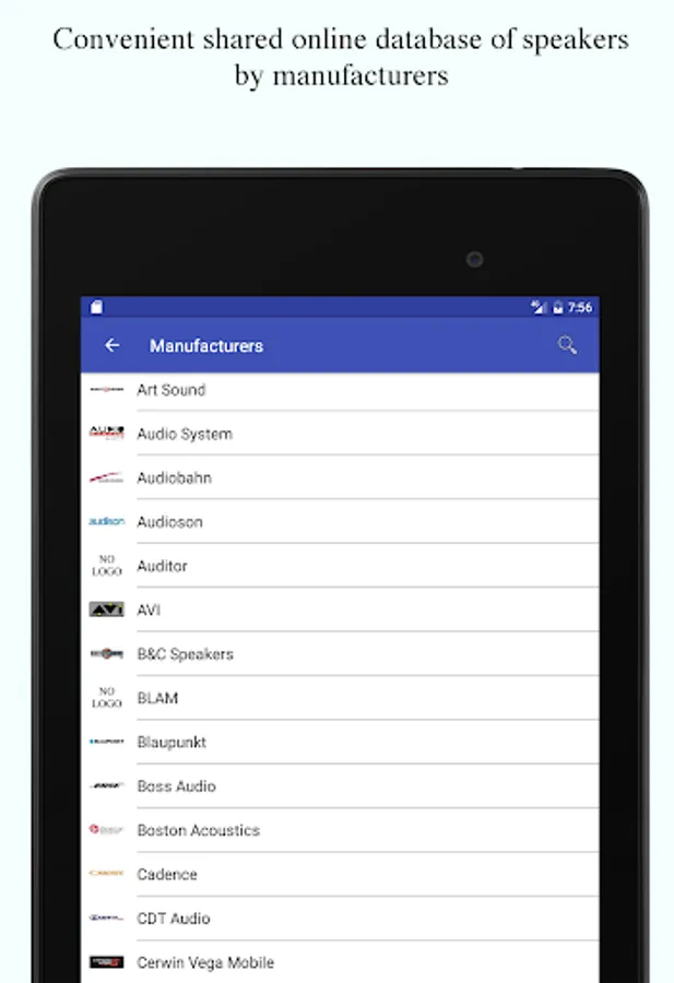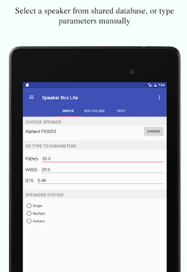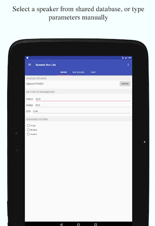 There is a shared on-line database of speakers(which contains about 4000 drivers), in which you can add your own speakers and edit existing one, and after it will review by a moderator it will be available to other users of «Speaker Box Lite».