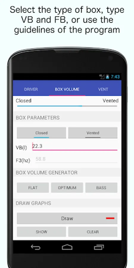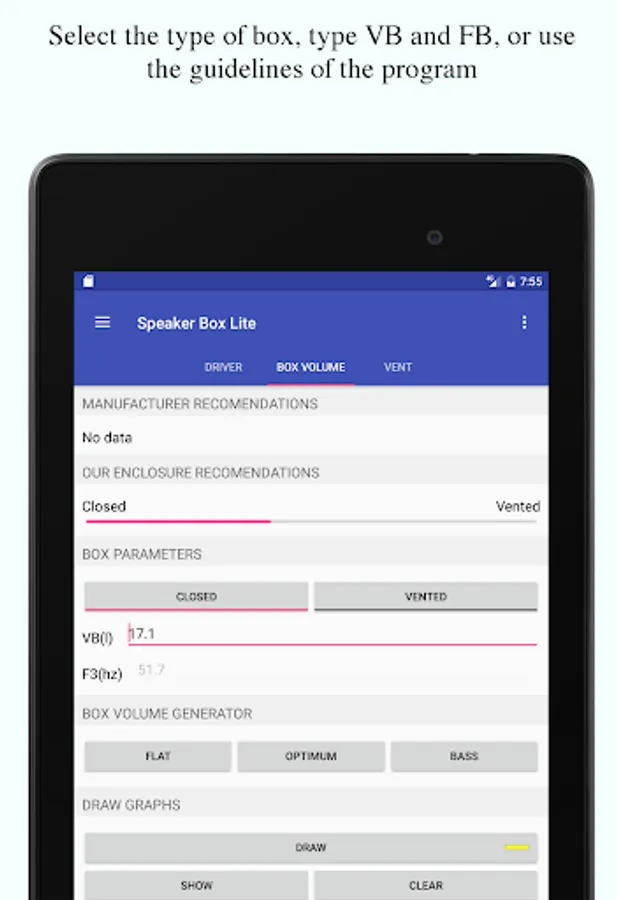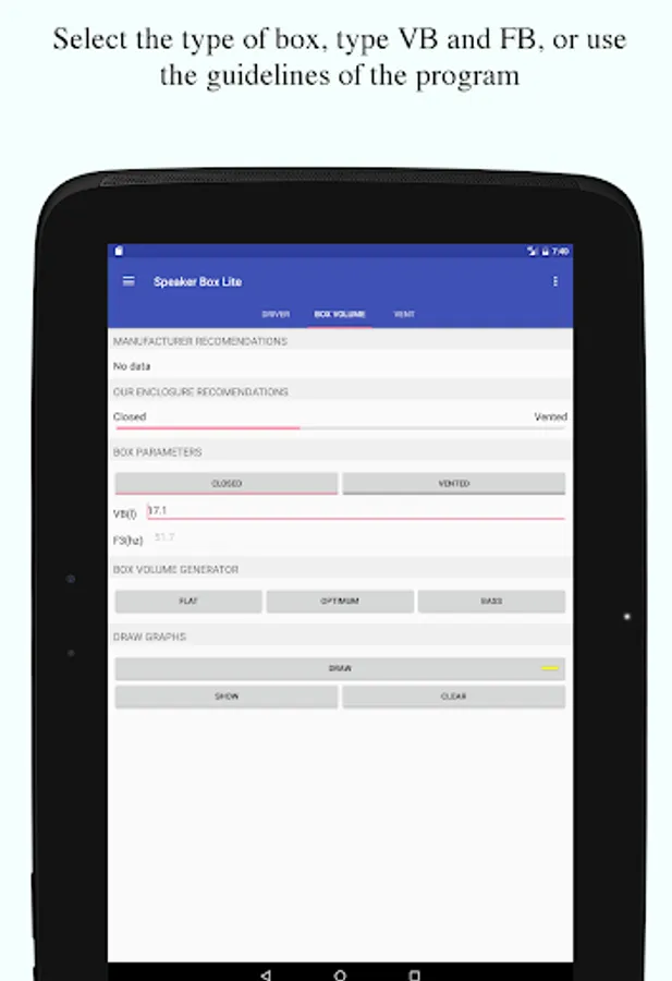 This app is designed for beginners and advanced fans of acoustic system building. The main feature is a calculation of the volume of the subwoofer box, according to his parameters Thiele-Small(FS, VAS, QTS). This is a list of features for box calculations: