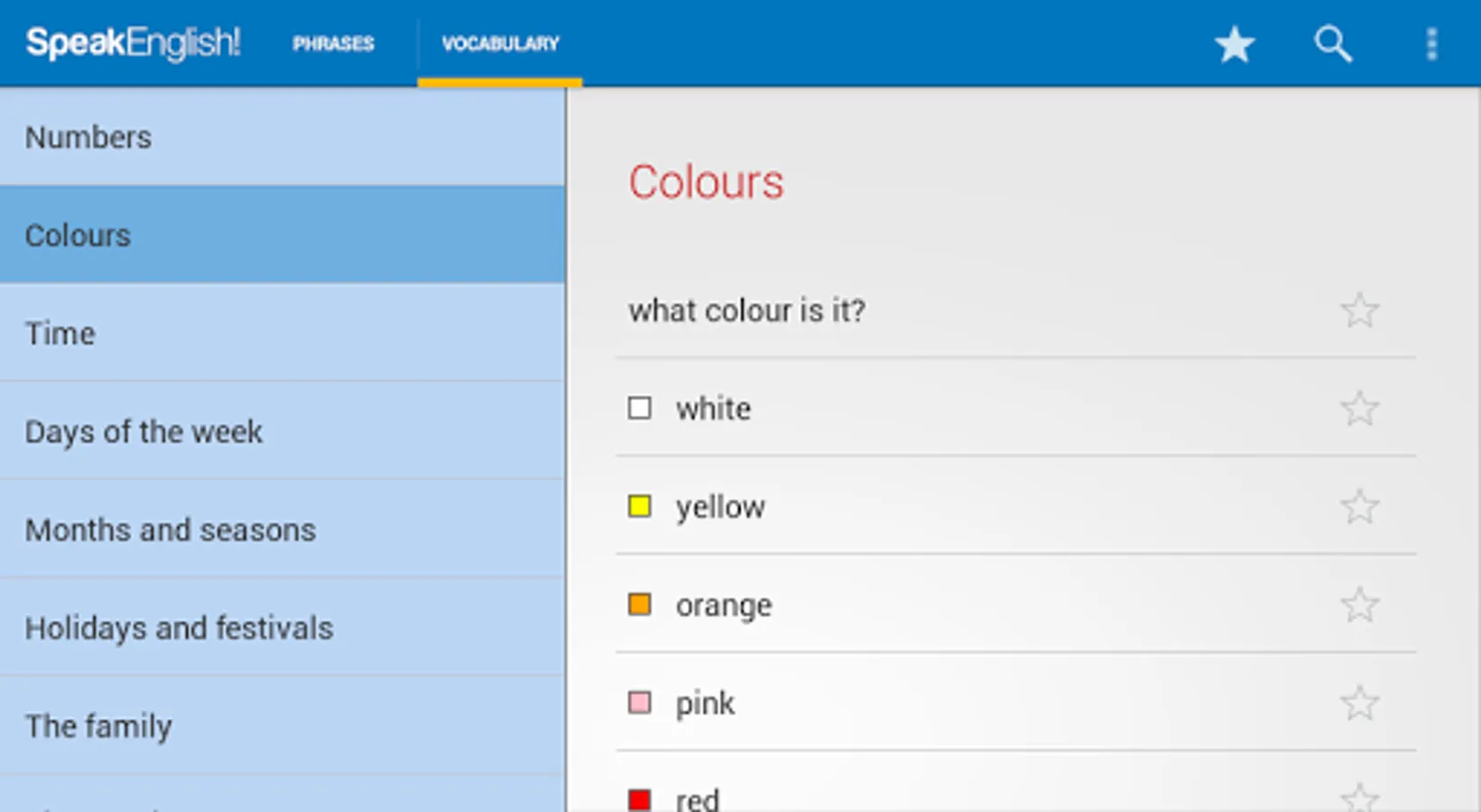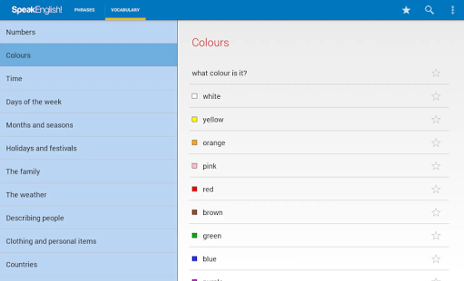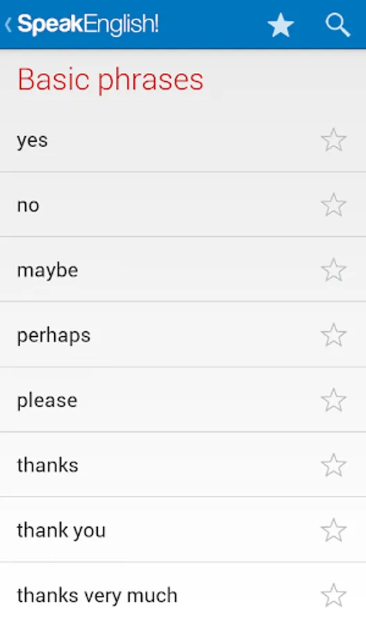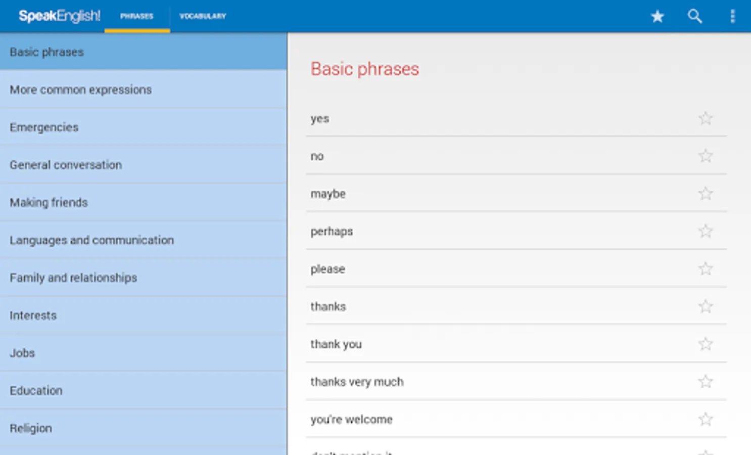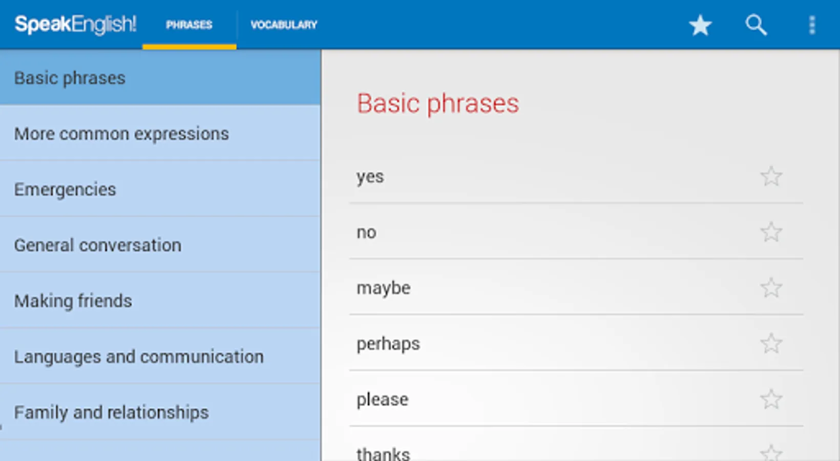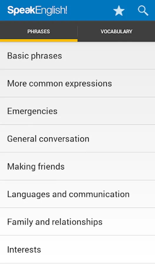The phrase guide part of the app contains over 2,500 English phrases divided into sixty everyday topics. The vocabulary part contains a further 3,500 essential English words sorted into themed lists.