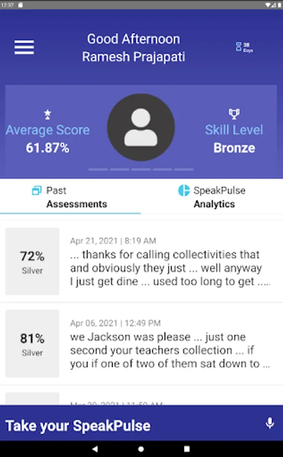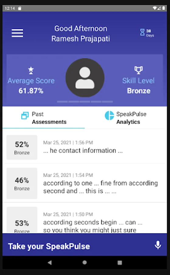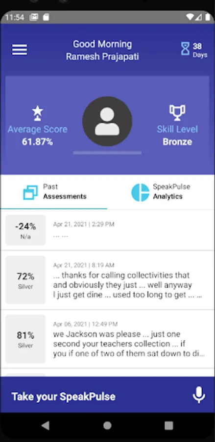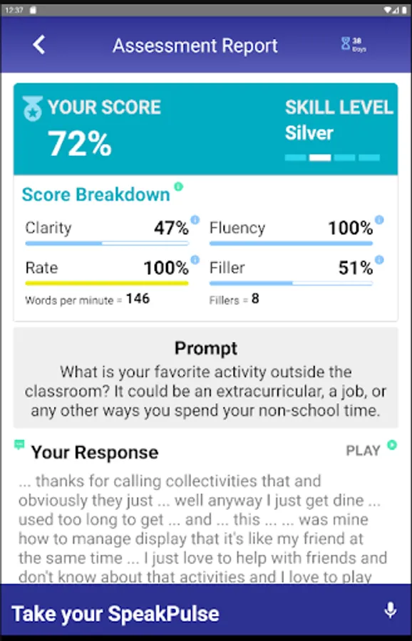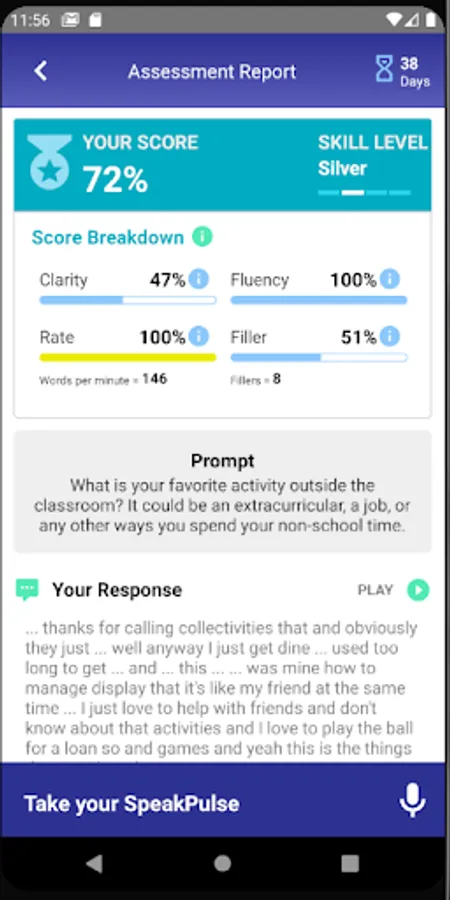 Using the app’s proprietary algorithm, Entity Academy analyzes an individual’s sample audio recording, and provides a composite score based on the individual’s speaking level. The score is based on key variables, such as the number of filler words, disfluencies or repetitions that are identified during a sample recording.