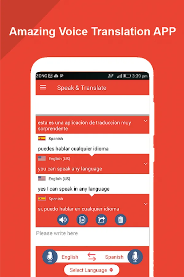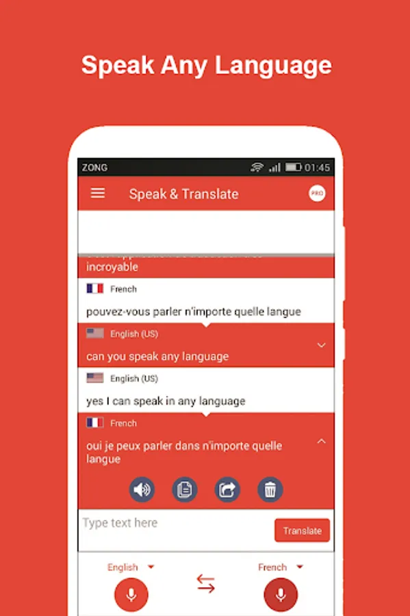 The third most striking feature of Speak to Translate in All languages app is that it has a very simple conversation interface. With the move of a simple button you can translate from one language and listen to the output in other language. The amazing voice to voice translation feature allows you to listen translated text automatically, you don't have to tap on speaker buttons again and again.