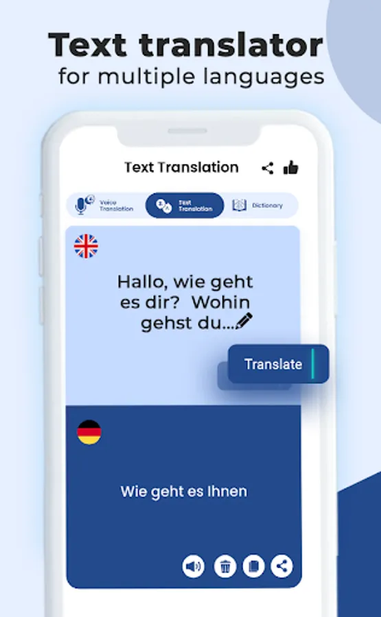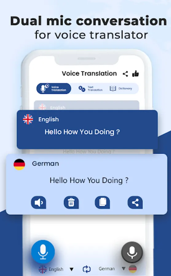 Speak and translate theme is based on real conversation translator in which two persons can translate their voice and text in different languages, it works as a real conversation between two people creating more ease while translation. Voice to voice translator helps to translate the speech of both persons in desired languages and it plays the translation aloud.