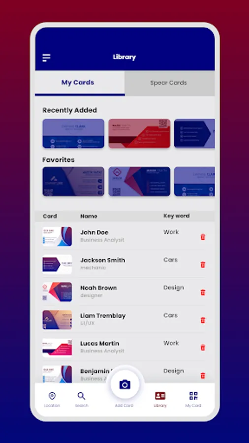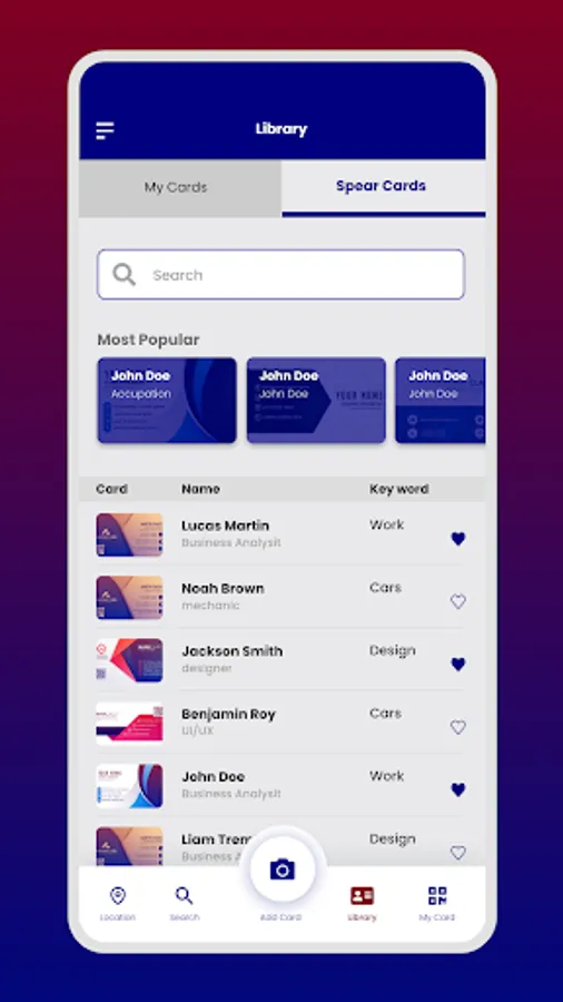 On the business side, companies can sponsor a card into the app which will be transferred into your LIBRARY where anyone using SPEAR can access it. GPS tracking can also notify the user via zip code coordinates when you are near a business in your database. You can also search for any business in your collection by typing key words.